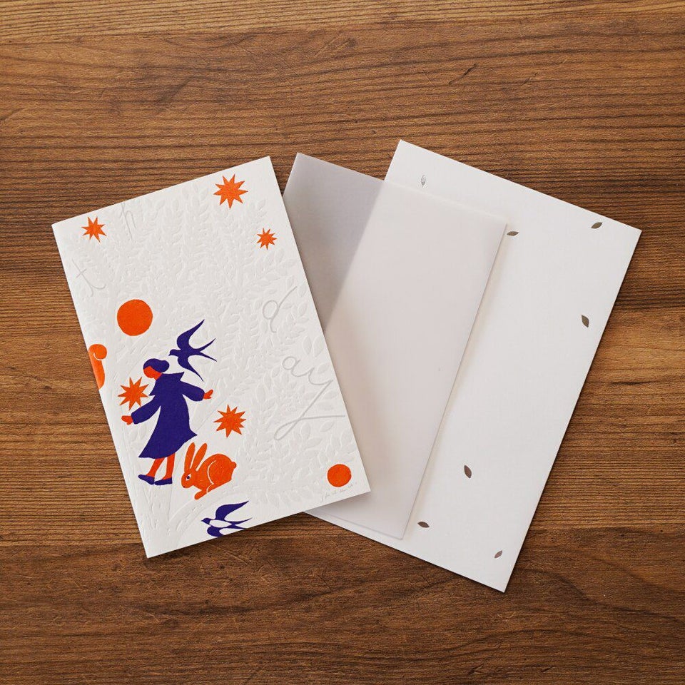 イラストレーター・西淑デザインの 二つ折りバースデーカード。カード全体に 繊細に施されたエンボス加工(浮き出し加工)で、誕生日の特別感を演出します。イラストの中には、「happy birthday」の文字が散りばめられています。