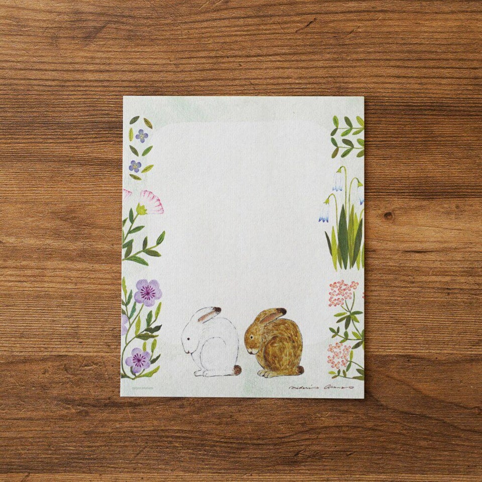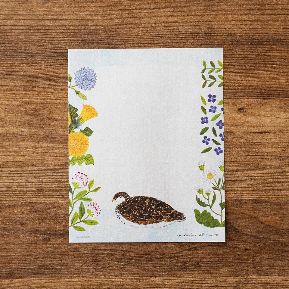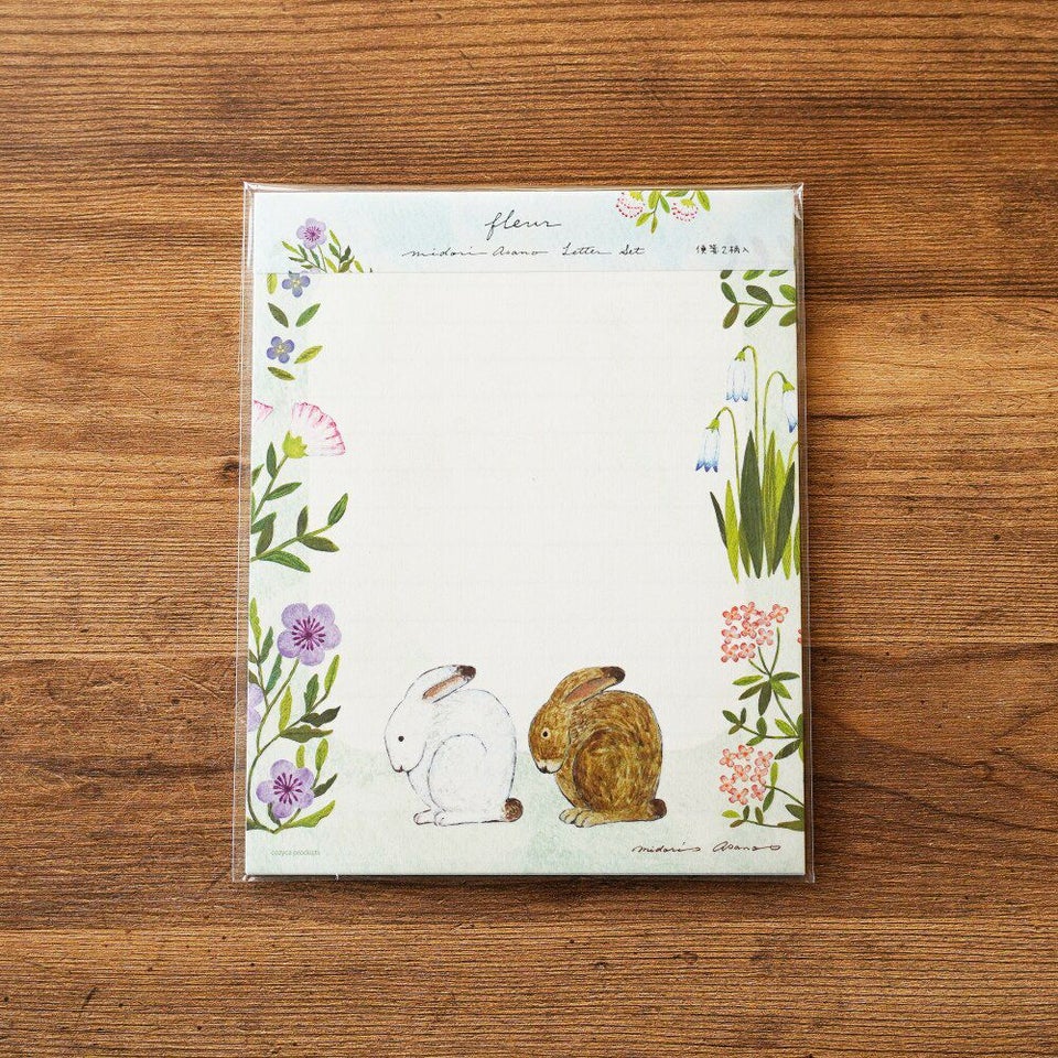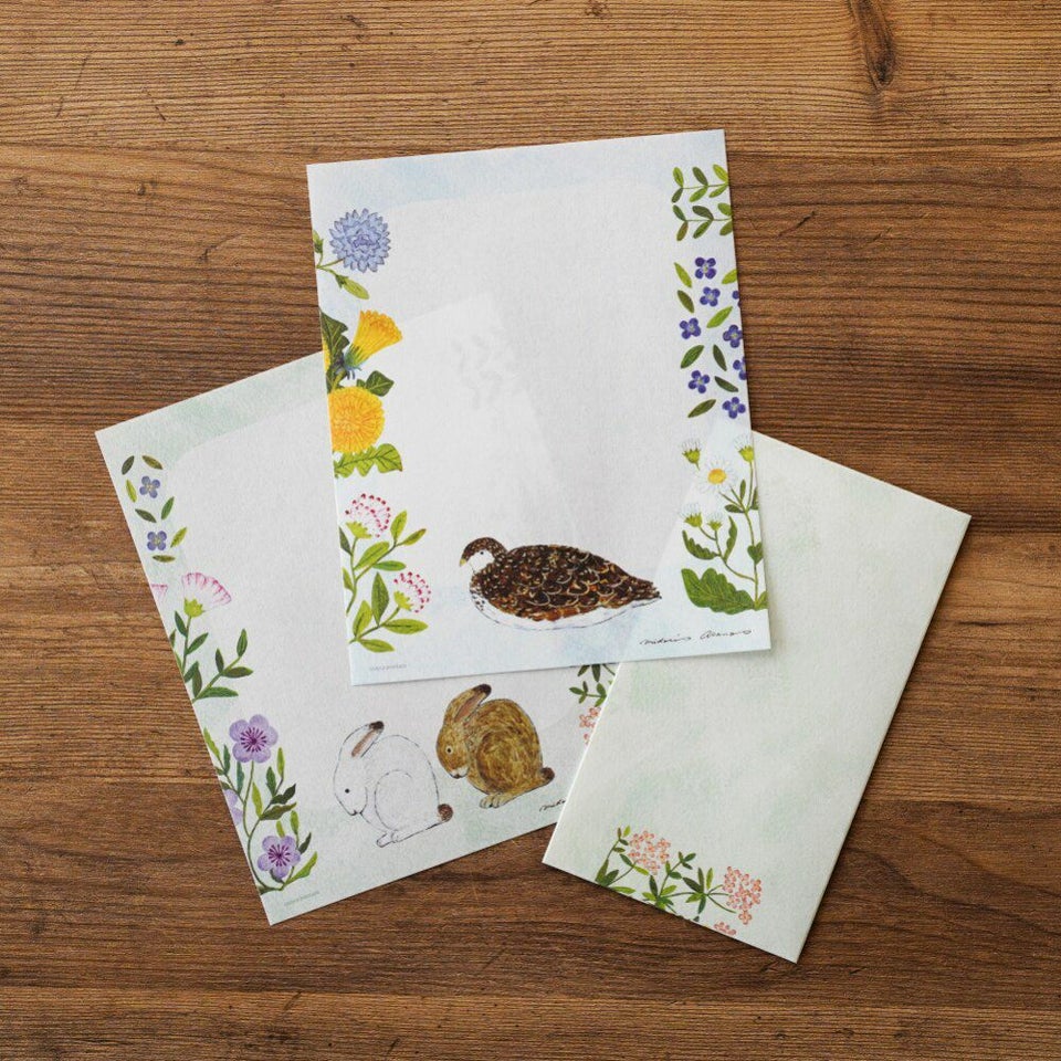 丁寧に描かれた草花や小動物がなんともかわいい、浅野みどりさんのレターセット。眺めていると、緑あふれるお庭にいるような心地に。受け取った相手もほっこり心癒されるようなお手紙が書けそうです。花柄ですが、緑と水色がベースの落ち着いた色づかいで、甘くなりすぎないのも使いやすいポイントです。季節のお便りにもおすすめ。