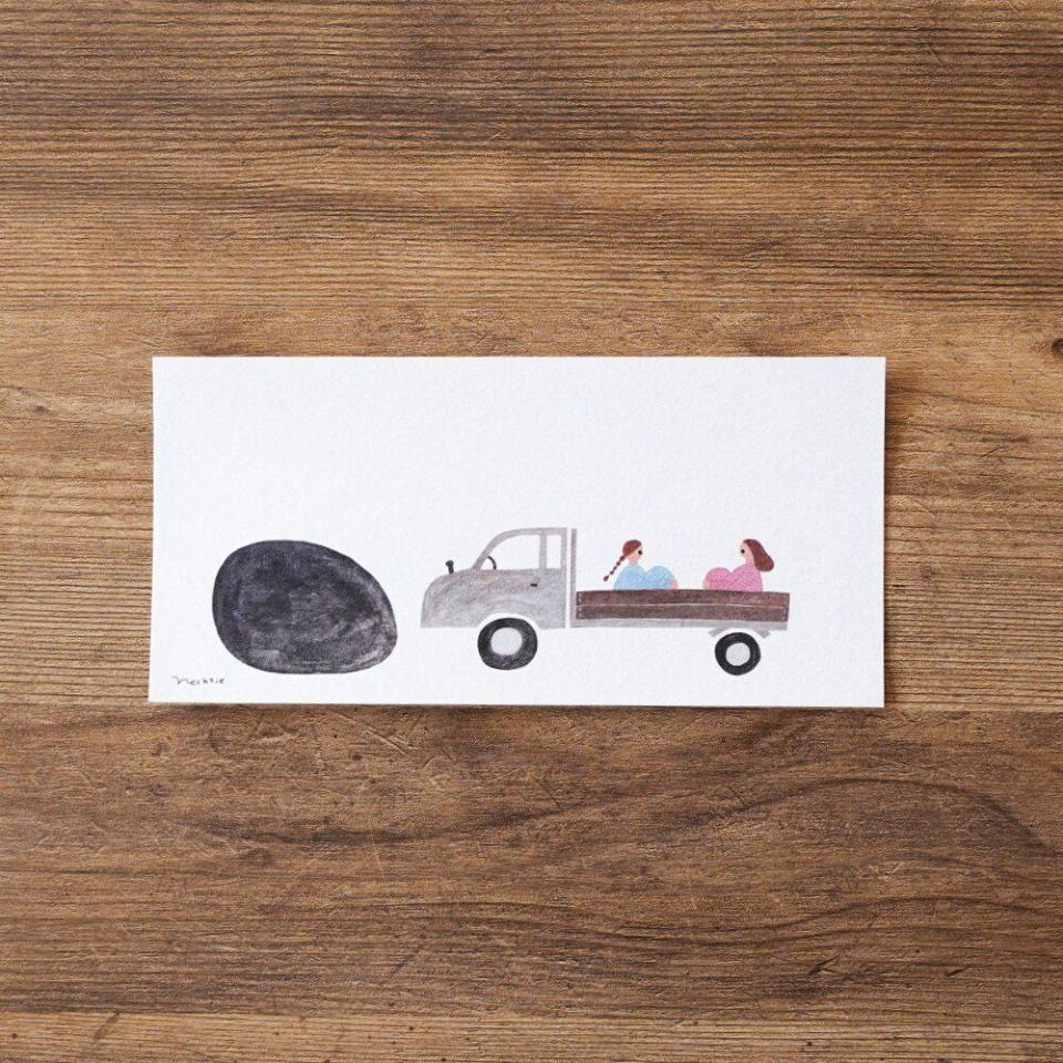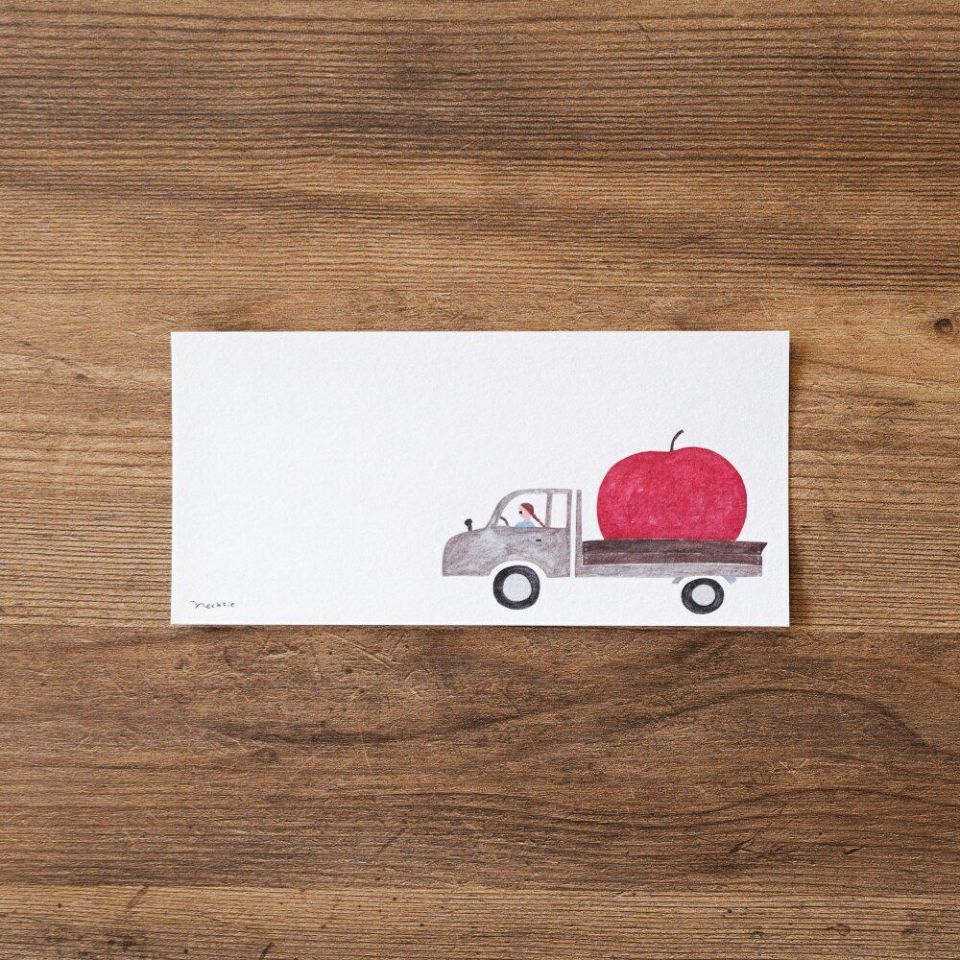 いろいろなものを運ぶトラック。大きな大きなりんご、コッペパン、ねこ…! メッセージを書けば、あなたの想いや気持ちもトラックが運んでくれますよ。