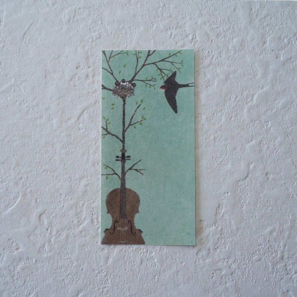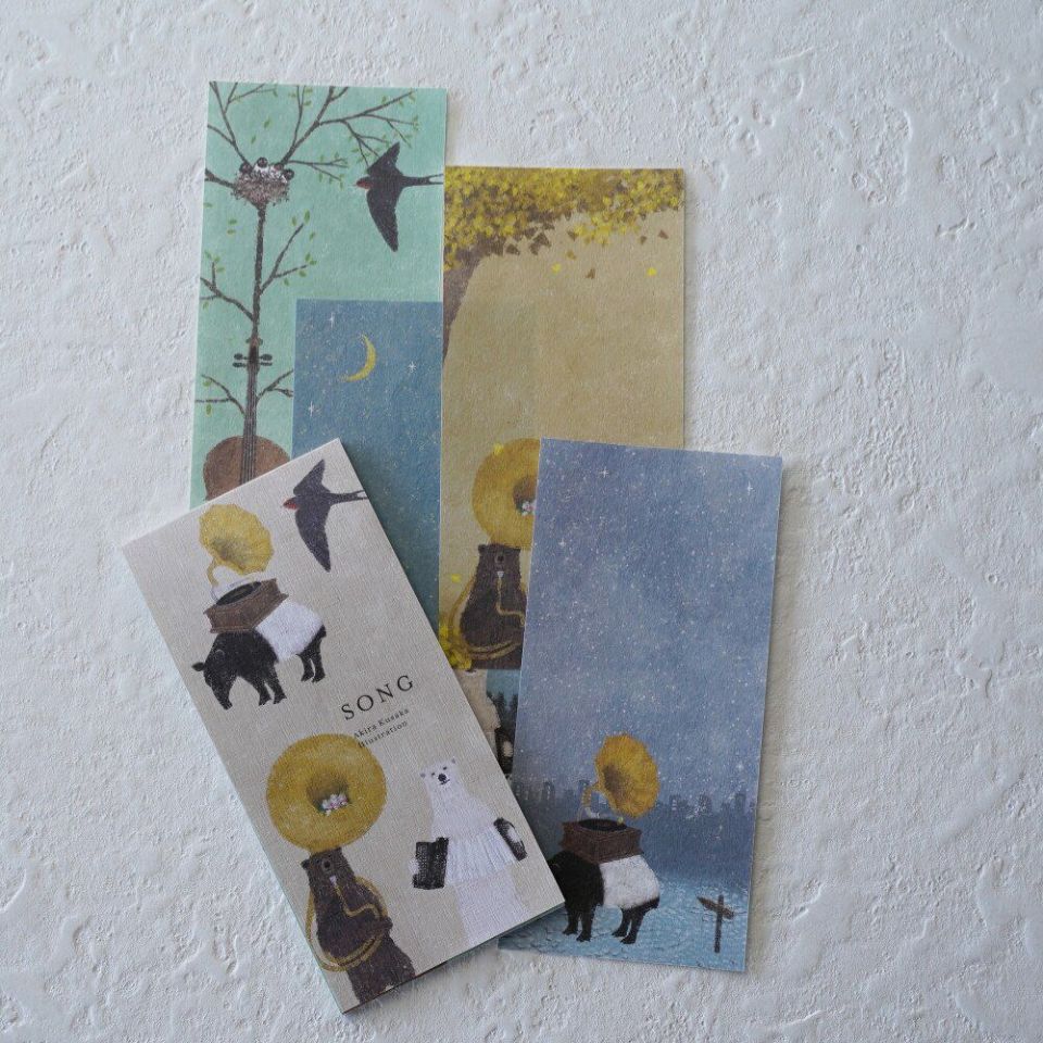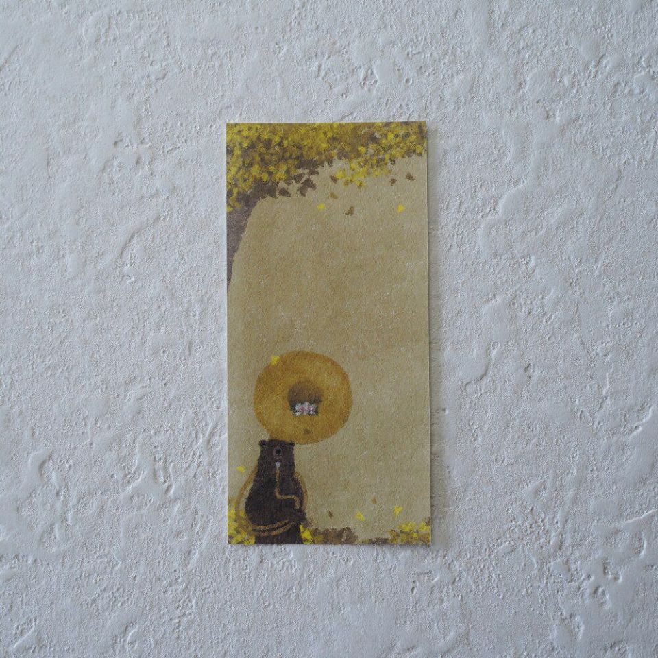 日下明さんの一筆箋。蓄音機、チューバ、アコーディオン、チェロ。メロディを奏でる楽器と動物たちが描かれています。どんな旋律を奏でているのか、想像がふくらむイラストたち。季節によって、使う柄を選ぶのも楽しいですよ。