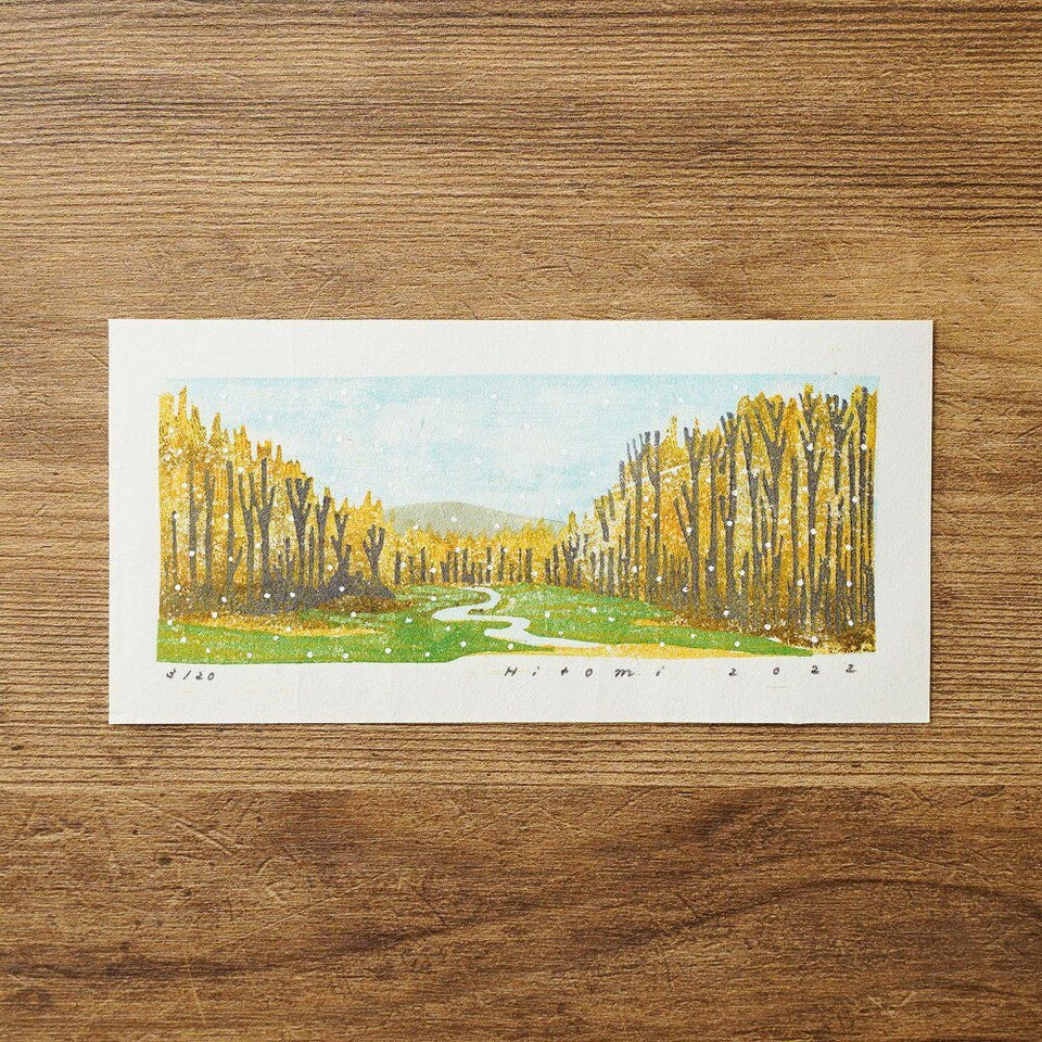 旅先や日常で見つめた風景を描いた木版画です。一枚一枚手で摺っているので、インクの乗りや掠れがそれぞれに若干異なります。色味も画像をご覧いただく環境で多少の差異はありますことご了承ください。