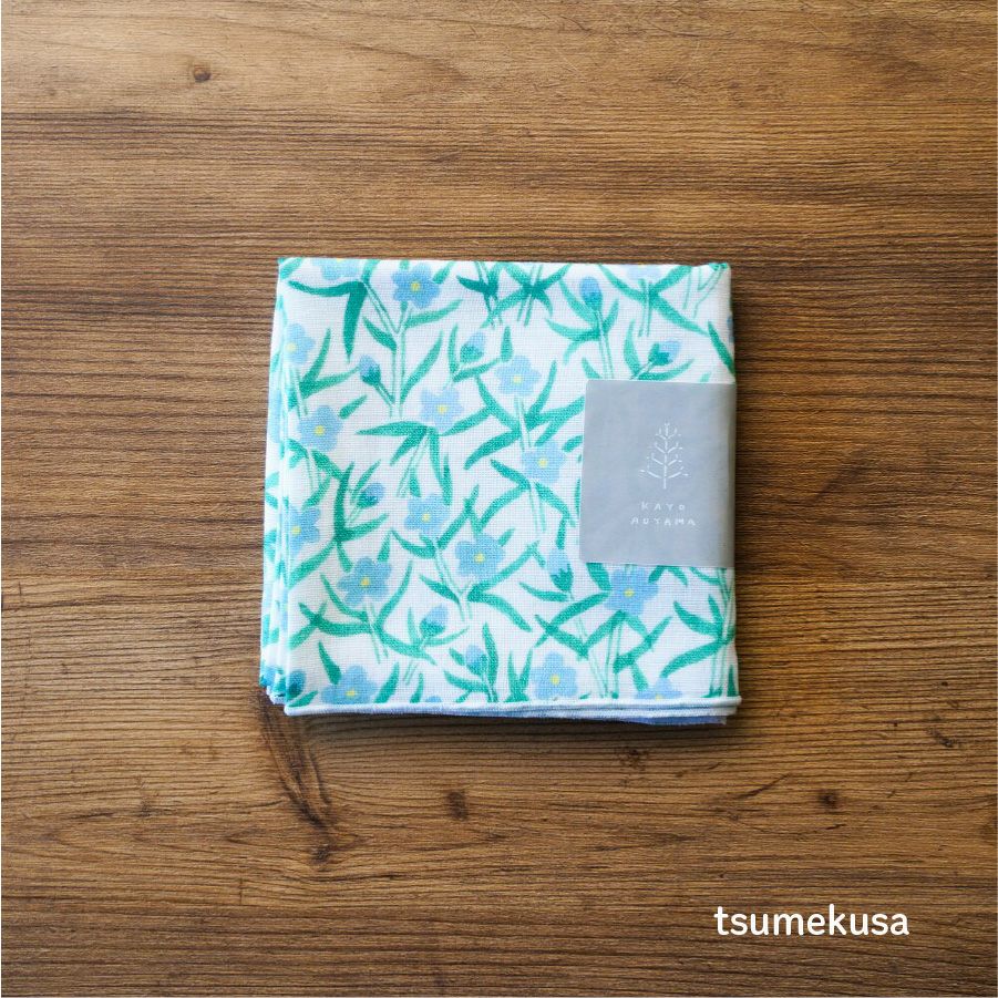 テキスタイルデザイナー・青山佳世さんの図案を、色のにじみや線の揺らぎをそのままに、肌触りの良いコットン100%のダブルガーゼ生地にプリントしたハンカチ。