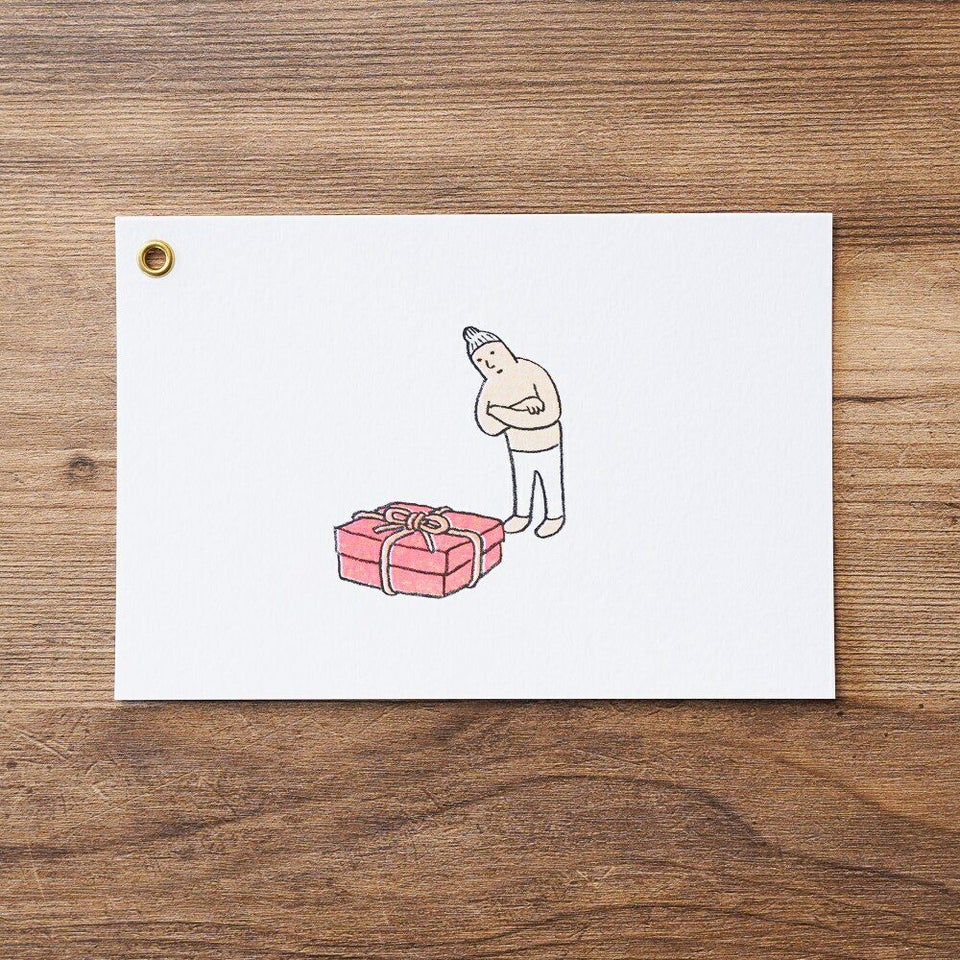独特の世界観を持ったイラストや絵画を手がけるmakomoさん描き下ろしのバースデーカードです。2枚重ねになっていてハトメで1点で留まっています。スライドさせるとそこには……。