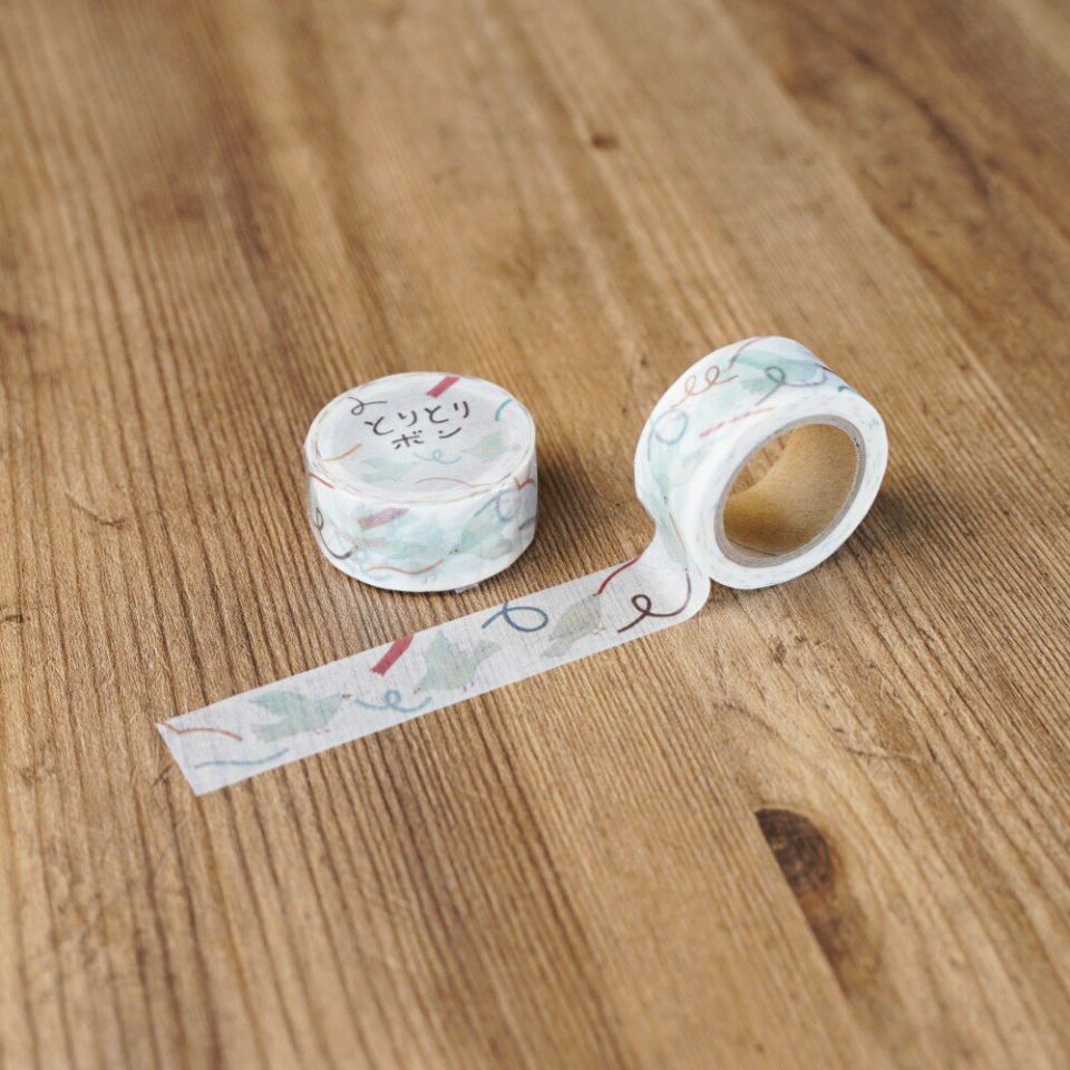 北海道にアトリエを構える、のりおさんとあさみさんによるものづくりユニット・ネクタイのオリジナルマスキングテープ「とりとリボン」です。楽しく使えて、明るい気持ちになるようなテープがつくりたいな! と思いうまれたデザインです。