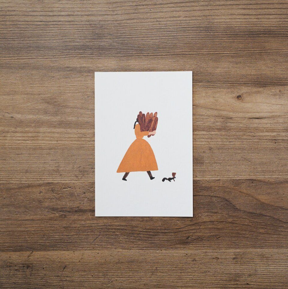 「パンをはこぶしごと」のポストカードです。黄色いワンピースの女の子。