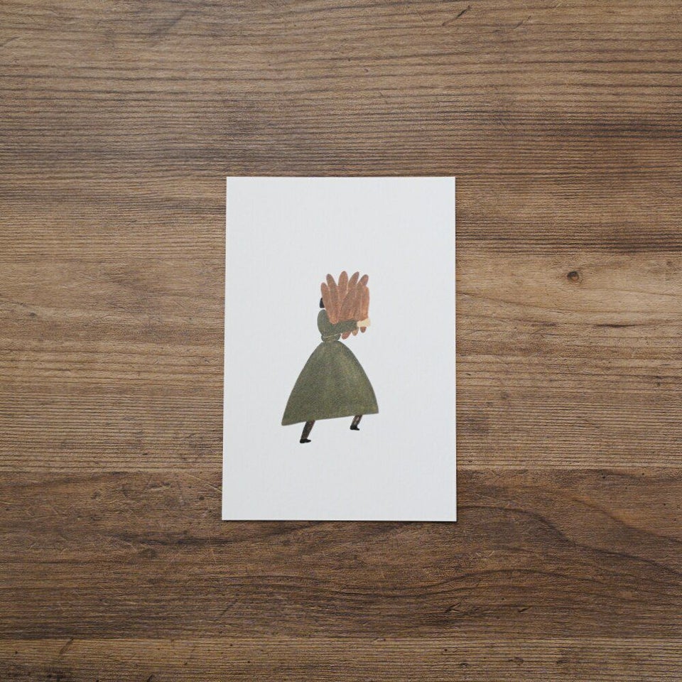 「パンをはこぶしごと」のポストカードです。緑のワンピースの女の子。