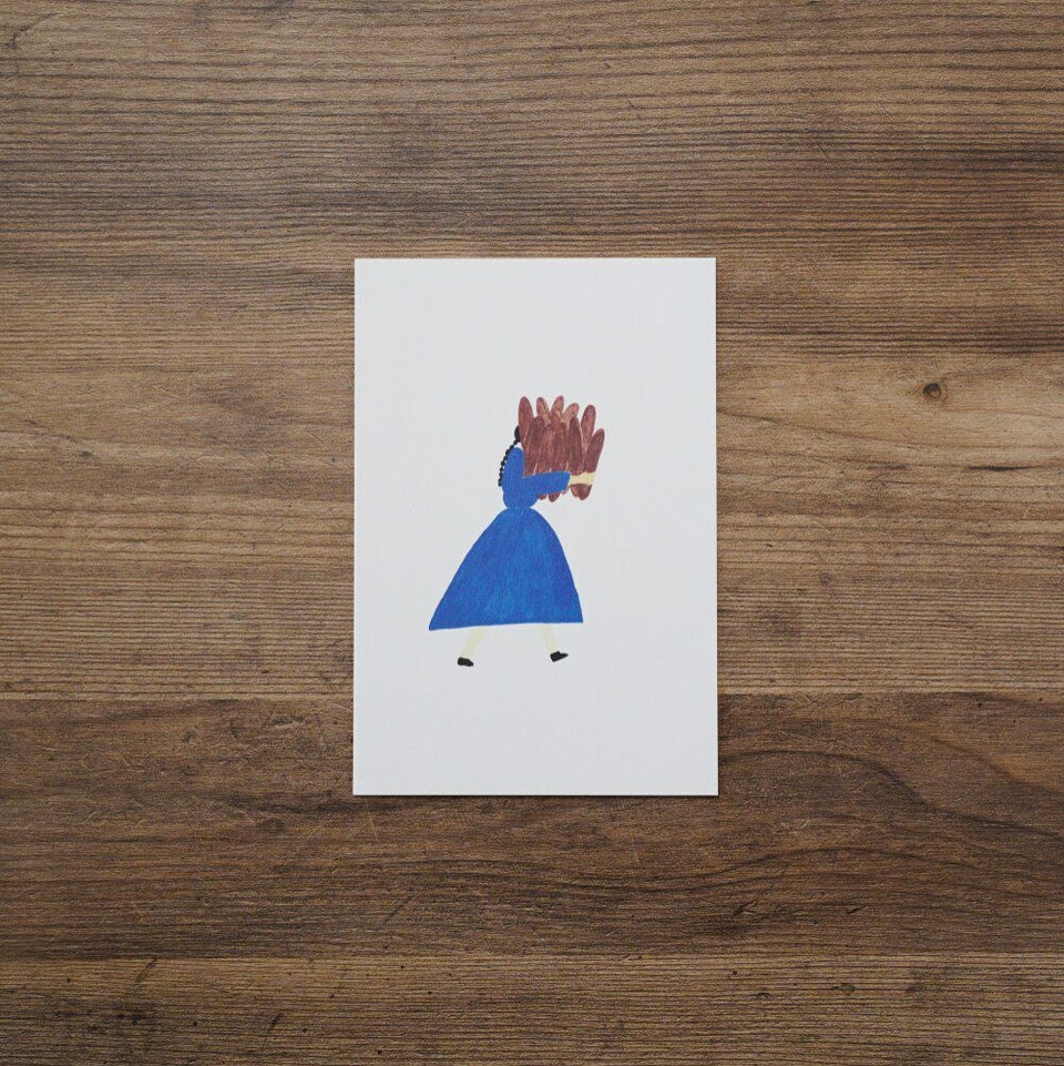 「パンをはこぶしごと」のポストカードです。青いワンピースの女の子。