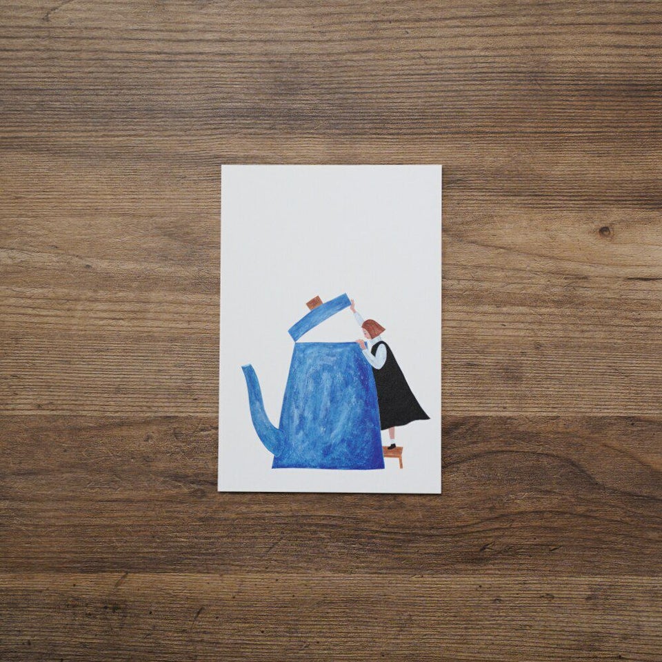 「ねこを探しています」のポストカードです。「青いポットの中」という絵です。