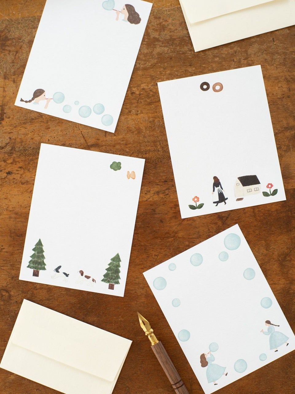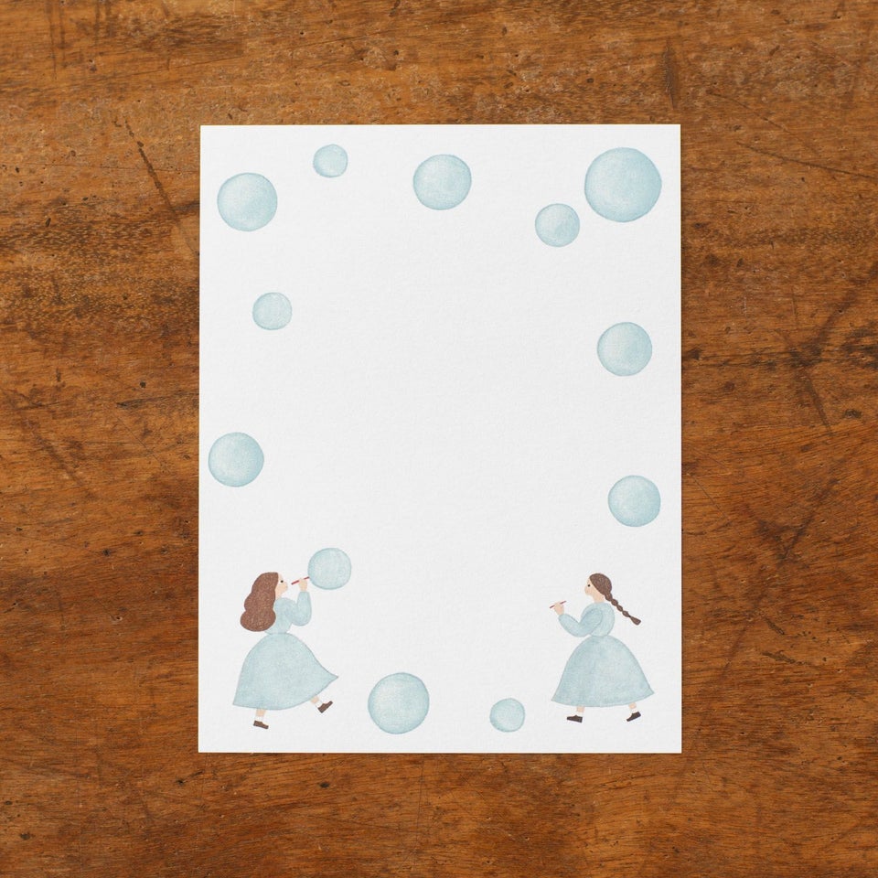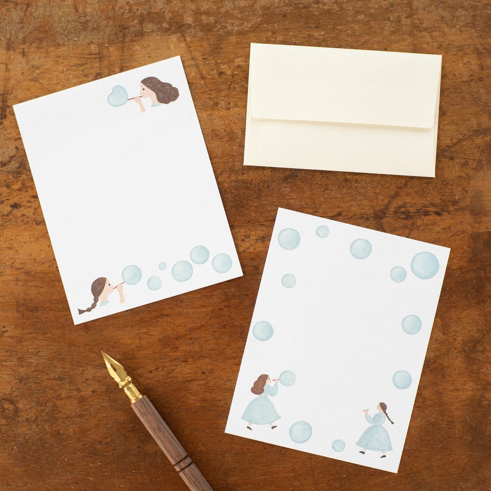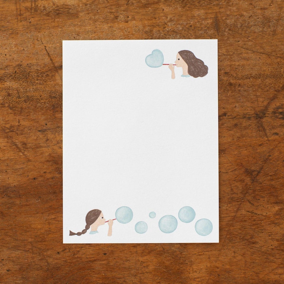 北海道にアトリエを構える、のりおさんとあさみさんによるものづくりユニット・ネクタイ。ゆるく描かれた動物や人物たちの中にネクタイらしいユーモアが潜んでいて、見る人を夢中にさせてくれます。シャボン玉のイラストがさわやかな小さなレターセットです。