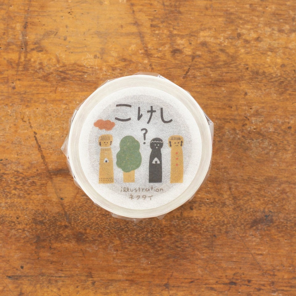 北海道にアトリエを構える、のりおさんとあさみさんによるものづくりユニット・ネクタイ。ゆるく描かれた動物や人物たちの中にネクタイらしいユーモアが潜んでいて、見る人を夢中にさせてくれます。こけしや、こけしじゃないものが並んだマスキングテープです。