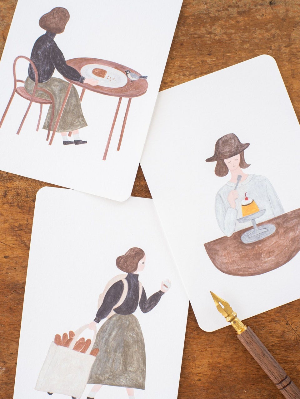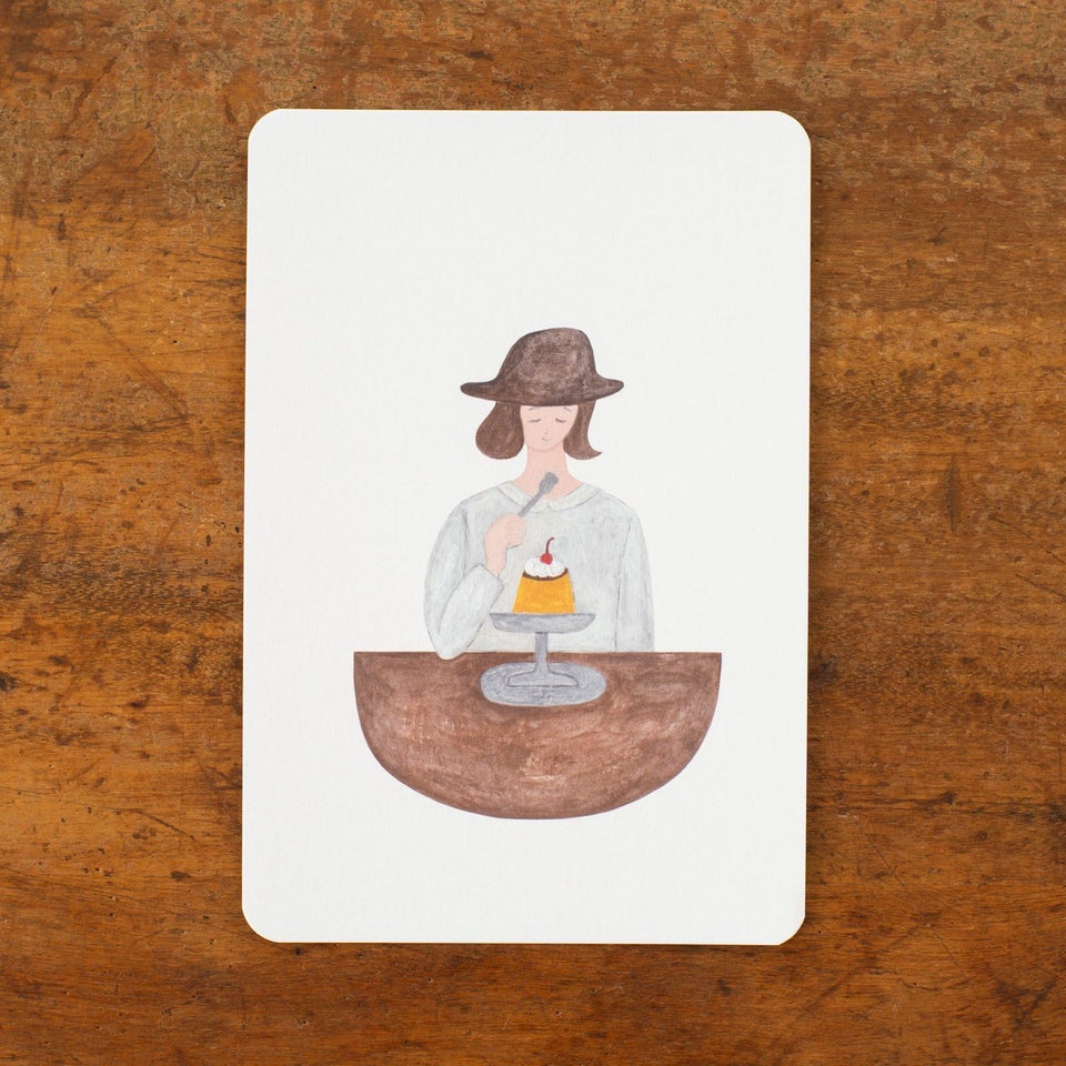 北海道にアトリエを構える、のりおさんとあさみさんによるものづくりユニット・ネクタイ。ゆるく描かれた動物や人物たちの中にネクタイらしいユーモアが潜んでいて、見る人を夢中にさせてくれます。固めのプリンを食べる女の子が描かれたポストカードです。