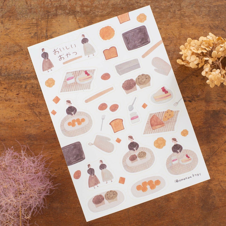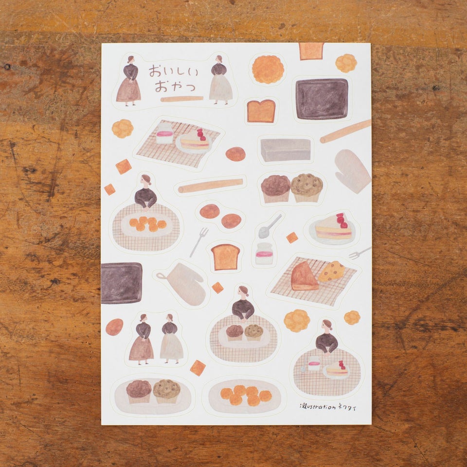 北海道にアトリエを構える、のりおさんとあさみさんによるものづくりユニット・ネクタイ。ゆるく描かれた動物や人物たちの中にネクタイらしいユーモアが潜んでいて、見る人を夢中にさせてくれます。ケーキ、スコーン、ビスケット。めん棒、天板、ケーキ型。おやつ好きな女の子。おやつにまつわる様々なものが描かれたシールシートです。