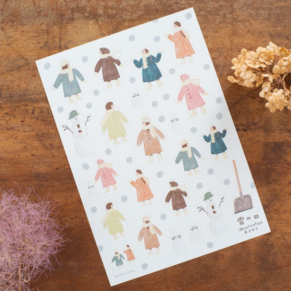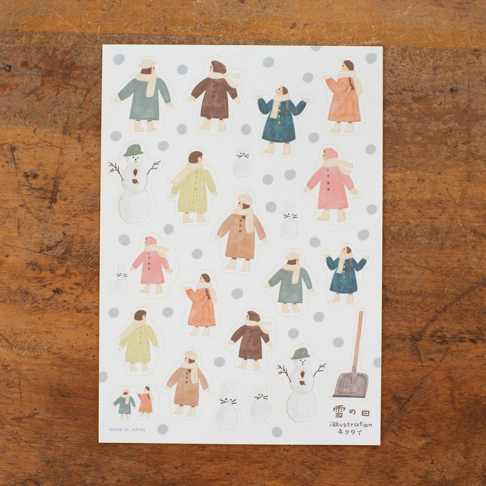 北海道にアトリエを構える、のりおさんとあさみさんによるものづくりユニット・ネクタイ。ゆるく描かれた動物や人物たちの中にネクタイらしいユーモアが潜んでいて、見る人を夢中にさせてくれます。ふわふわ舞う雪とカラフルなコートを着た女の子たちが描かれたシールシートです。