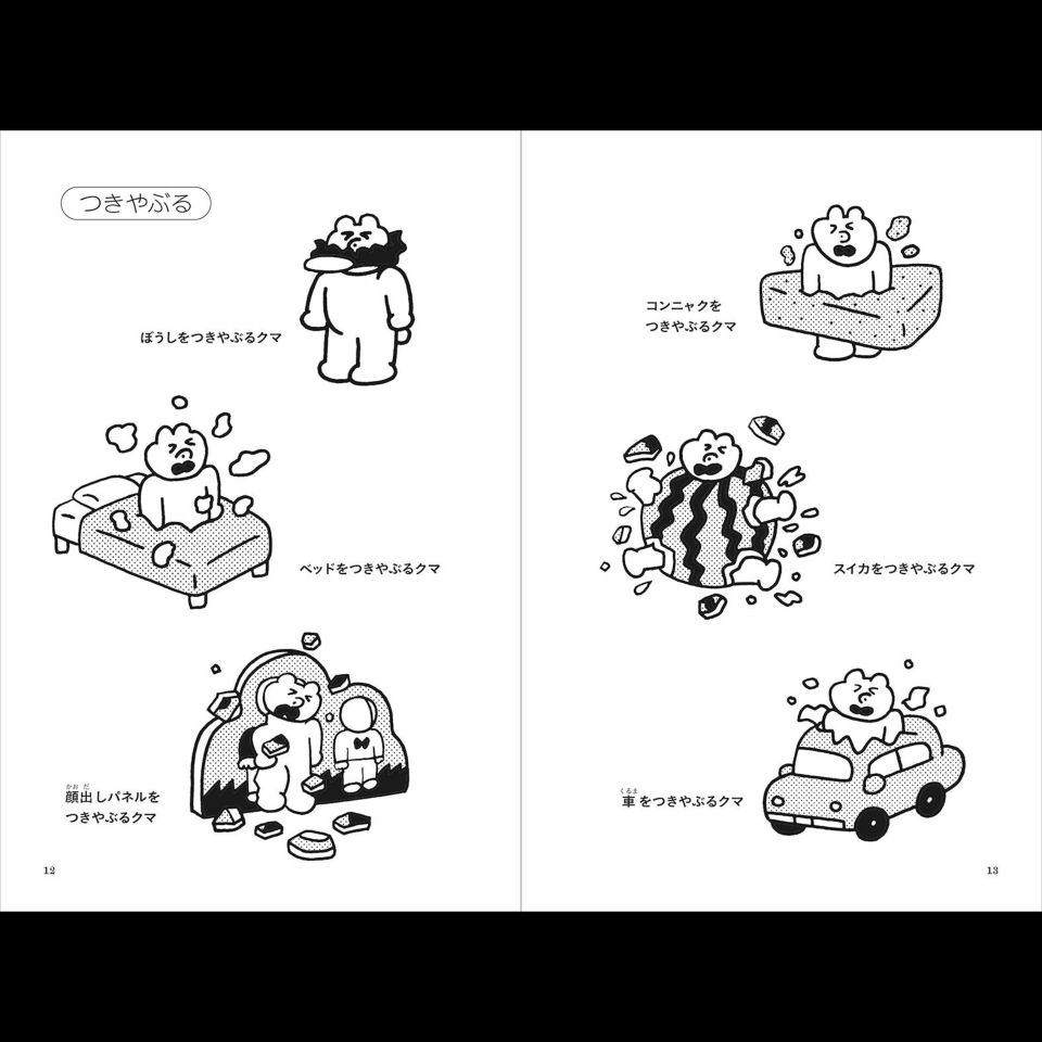 タイトルは『つかいにくい図案帖』。書名からしてもうニシワキさんワールド満載です。「もくじ」には「季節・行事」「学校」「喫茶店」といった図案帖らしいカテゴリが並ぶ中、「ストレッチ」「つきやぶる」「ねじる」といった謎の項目も……開けばひらくほど、クセになる図案帖です。