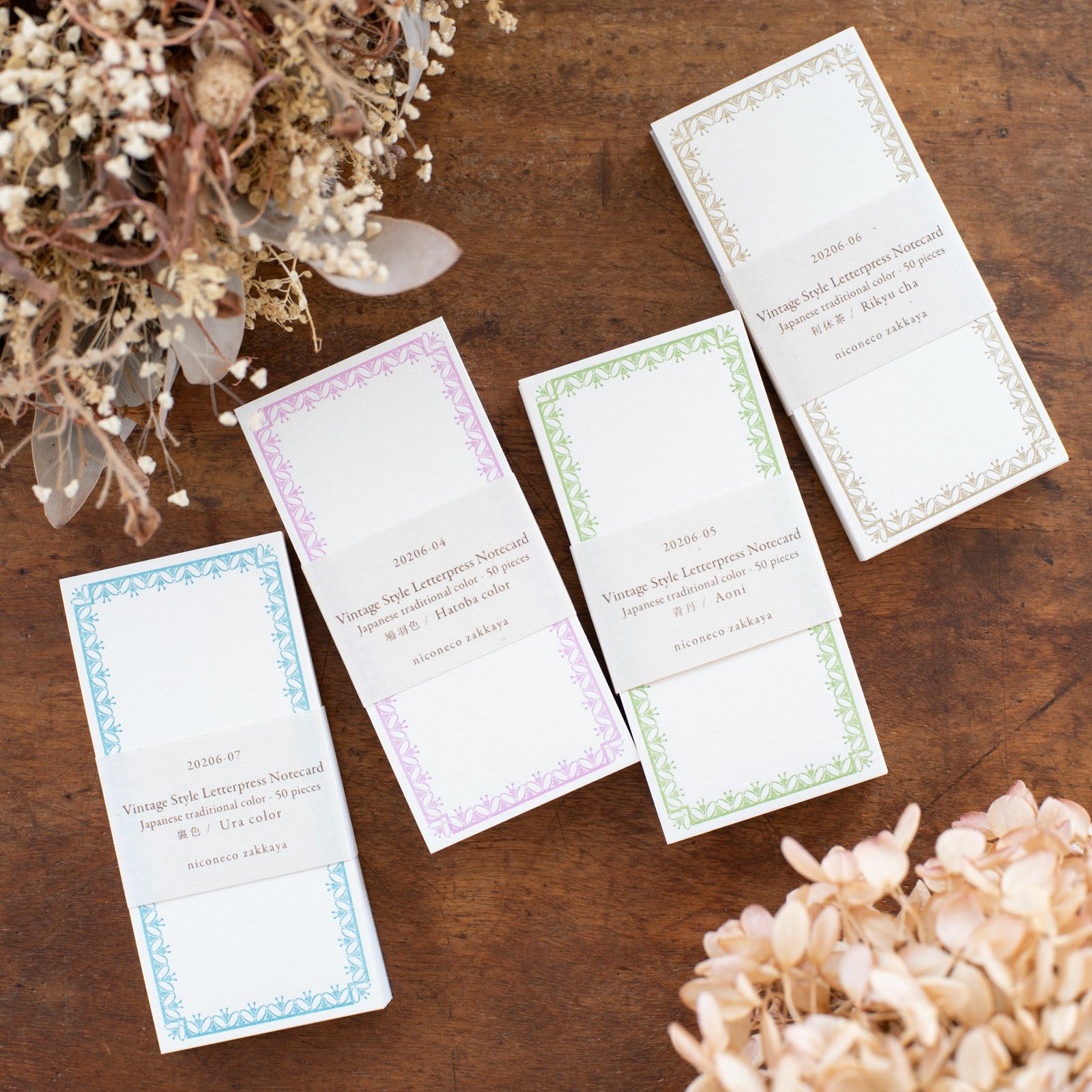 大阪府守口市にある「大枝活版室」は、何十年もの間眠っていた小さな印刷所を印刷工とデザイナーで再生させスタートしました。活版印刷の技術を生かして、 暮らしに寄り添う紙文具を作っています。 こちらはニューヨークに実店舗を持つ、「niconeco zakkaya」とのコラボで生まれたNote cardです。名刺より細長いサイズでメッセージカードとして使える厚みもあり、たっぷり50枚セットなのも嬉しいポイント。ちょっとしたメッセージを書きたいときや手帳デコにもぴったりです。4種類の美しい和色からお好きなお色をお選びください。