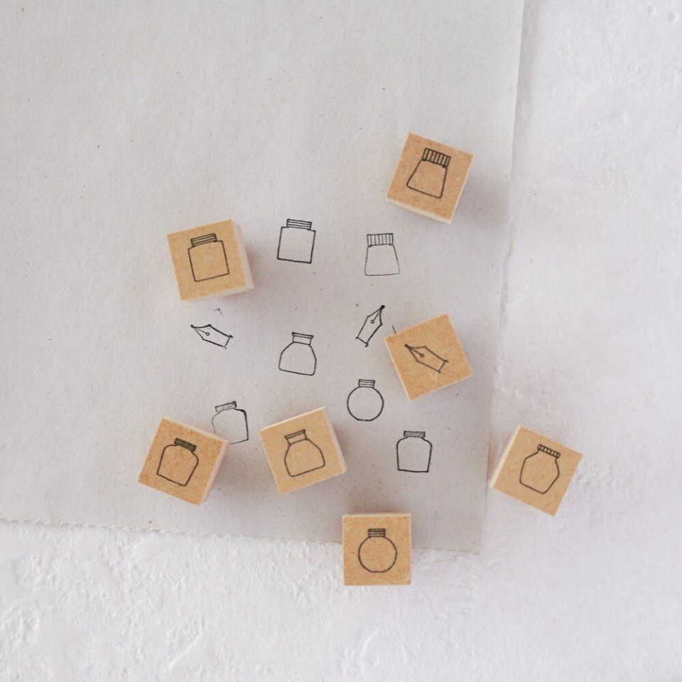 「インクボトル・ペン先はんこ」は、万年筆やガラスペンやつけペンなどで使うインクのボトルやペン先をイメージして線画でデザインしました。インクログやインクのコレクションの記録することを想定して考えたちいさなハンコ(ゴム印)です。