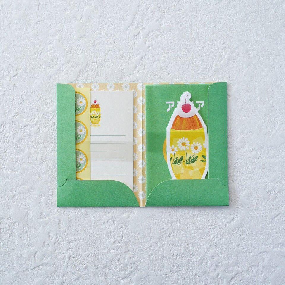 保管に便利な紙のケースに入ったミニレターセットです。2種類の便箋に、グラスの箱をイメージした封筒とロゴマークの形をした封緘シールがセットになっています。