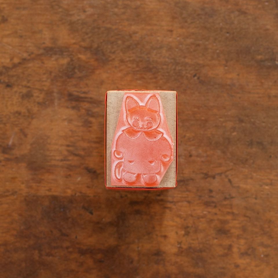 「日常に溶け込む」をモットーに、イラストレーターとして活動するしゃもたさん。くるりと巻かれたビビッドカラーの紙がポイントの大きめスタンプは、手帳やお手紙など色々なところに押したくなること間違いなし! おめかしした猫ちゃんのスタンプです。