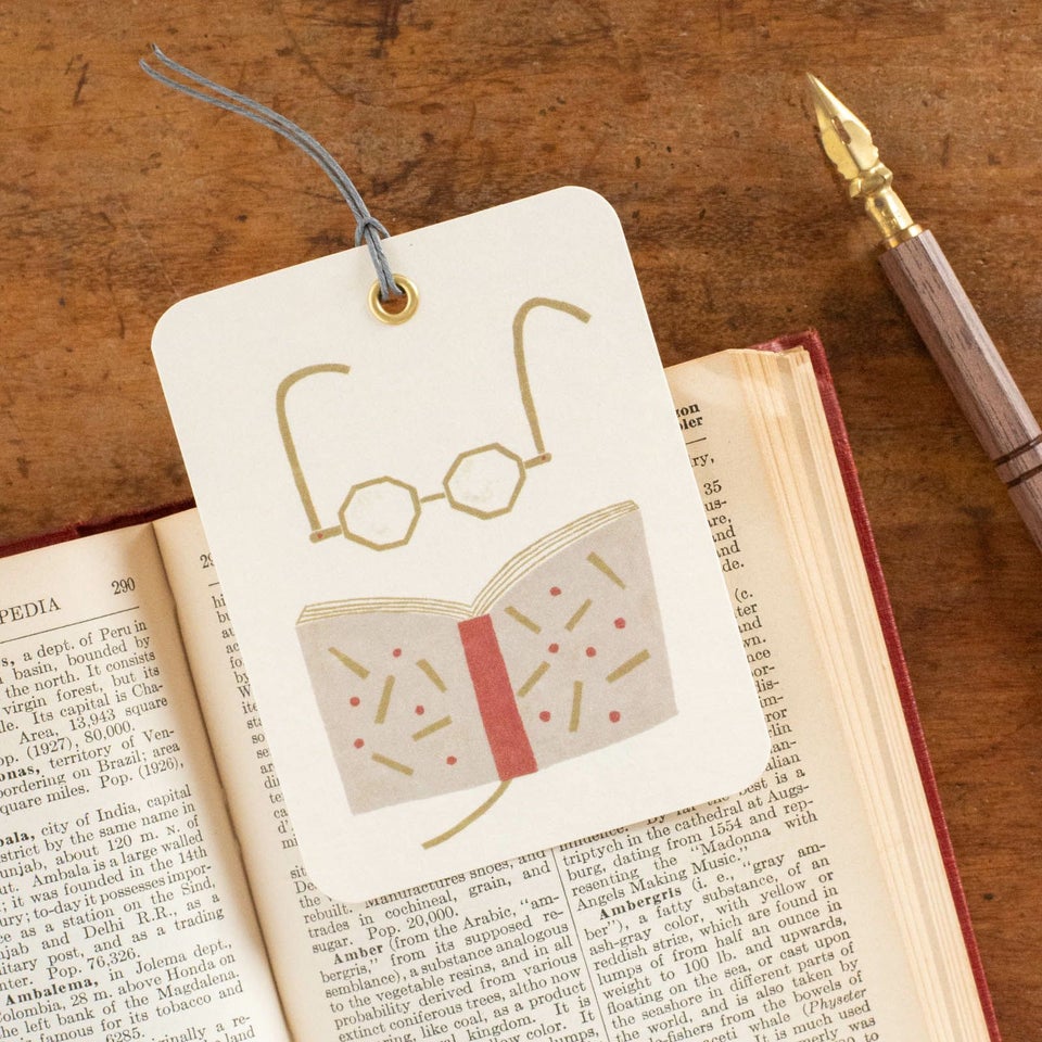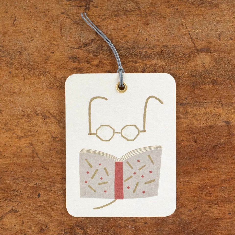 金縁メガネと本のイラストが描かれたメッセージタグ。本に挟んでしおりとして活用すれば読書するたびにわくわくしそうです。