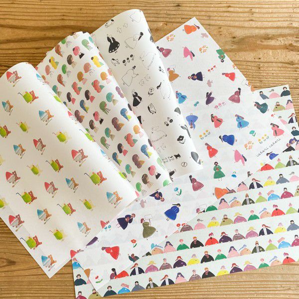 代名詞とも言える女の子をモチーフにした、乙女心をくすぐる包装紙の登場です。ふんわりしたワンピース姿で走ったり、何かを頬張ったり、おすまししたり…所々に登場する鳥や猫にもご注目です(特に猫のお尻が可愛い!)。