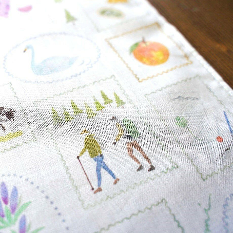 デザインは、長野県や松本市にちなんだモチーフを散りばめたもの。ライチョウやりんごなどの名物から、温泉の桶や喫茶店メニューまで様々な図案が優しい水彩で描かれています。是非ひとつひとつ探してみて下さいね。柔らかな手触りの大きめサイズハンカチ。お出かけのお供にいかがでしょうか。