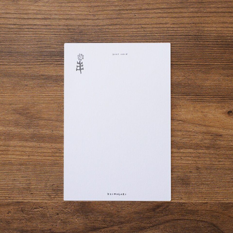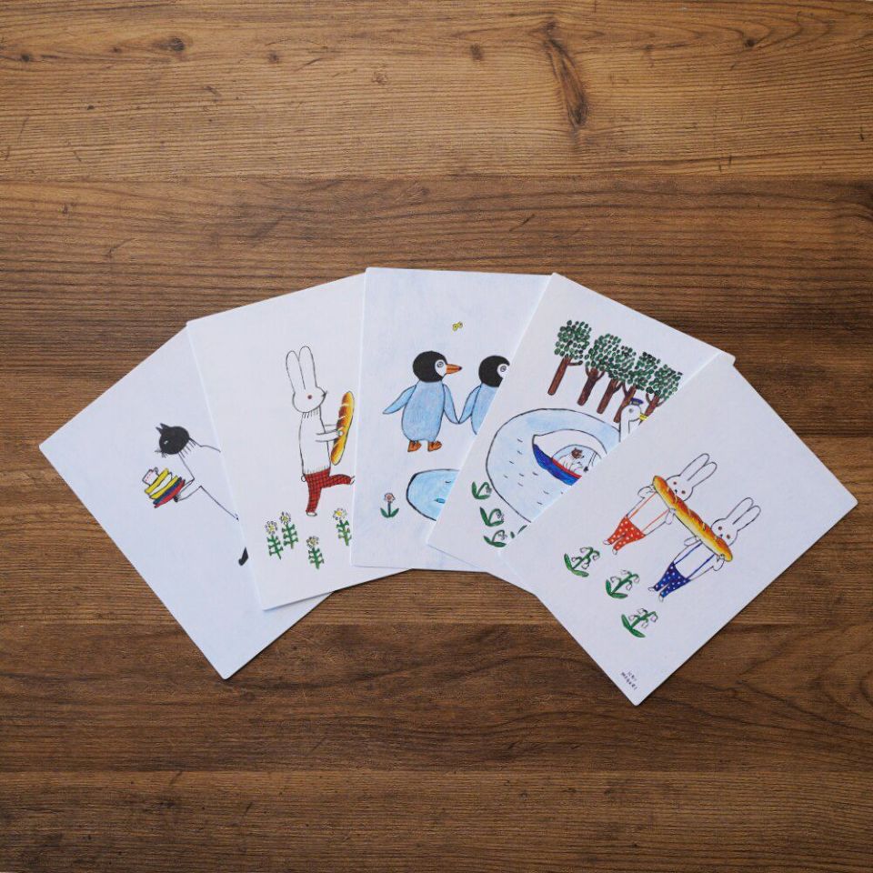 イラストレーター・茂苅恵さんが描く、絵本の1ページのようなポストカードです。赤い瞳とチェックのズボンがチャーミングなうさぎは、こんがりと焼けたフランスパンを持ってどこへ行くのでしょう。そんな物語を想像をしながら眺めるのも、また楽しいですね。