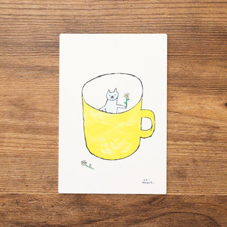 イラストレーター・茂苅恵さんが描く、絵本の1ページのようなポストカードです。鮮やかな黄色のマグカップから顔を覗かせるネコ。1時にお花をゆらゆらさせるのが決まりのようです。おうちのマグカップにこんなネコがいたら、可愛くて毎日覗いてしまいますね。