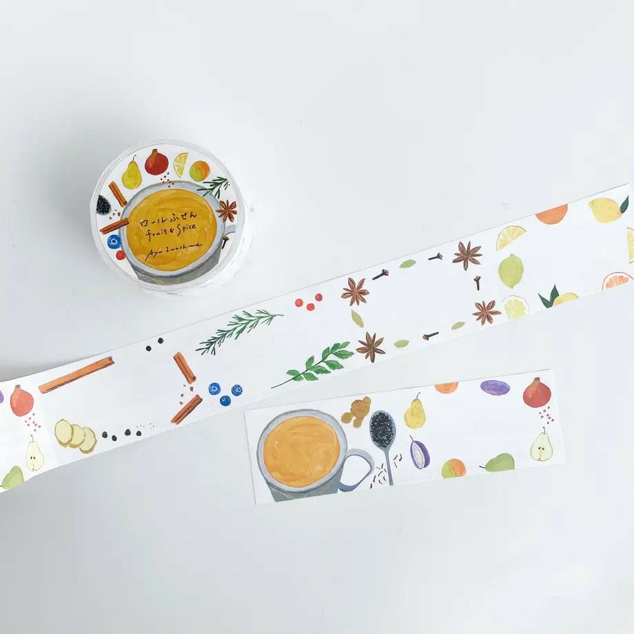 食べ物や暮らしまわりのイラストを得意とする、イラストレーター・いわしまあゆさん。いろいろなフルーツとスパイスが印象的なロールふせんは、お菓子やジャムのおすそ分けに添える時にもぴったりなデザインです。甘い物が好きのあの人へのプレゼントにも。
