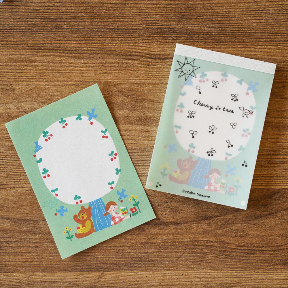 “切り絵”の技法で表現される杉浦さんの作品は、可愛いらしくどこかレトロな色合いで、つい手に取りたくなってしまうデザイン。さくらんぼの木の下に集う女の子とクマさん。青い小鳥たちも、美味しそうにさくらんぼをついばみ、楽しいひととき。トレーシングペーパーの表紙が重なったデザインも可愛く、グリーンの背景が爽やかなメモパッドです。少しざらざらした風合いのある紙を使用しています。