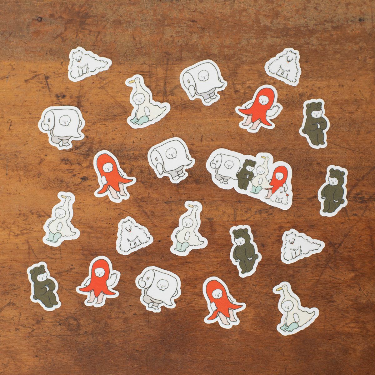 トイレットペーパー、タコさんウィンナー、クマ、鳥の、シュールでキュートなかぶりものを身につけた子どもたちが大集結!ふわふわのわんこ「もうふ」も一緒です。 目に入るたびニヤリとしてしまいそうなその姿に、どんなところに貼って楽しもうか、考えるだけでもワクワクさせてくれるシールセットです(全員集合のピースも最高!)。