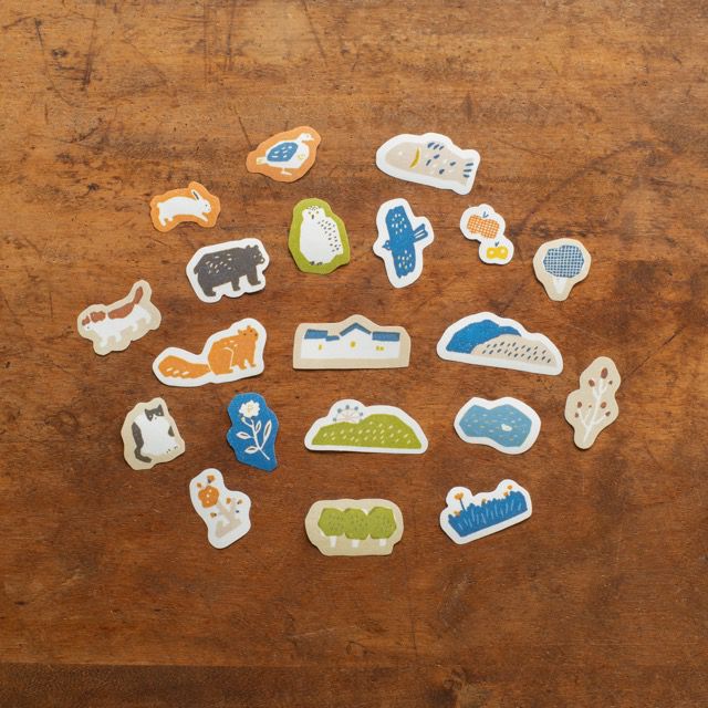 木版画でイラストを描く、大川菜々子さん。手紙社オリジナル商品初コラボレーションです! 落ち着いたくすみカラーで描かれた動物や自然風景のフレークシールは、眺めているとほのぼのとした気持ちになります。1枚1枚切り離されているので、使い勝手も抜群。手帳の隙間も素敵に彩ってくれるシールです。和紙シールの柔らかな透け感もお楽しみいただけます。