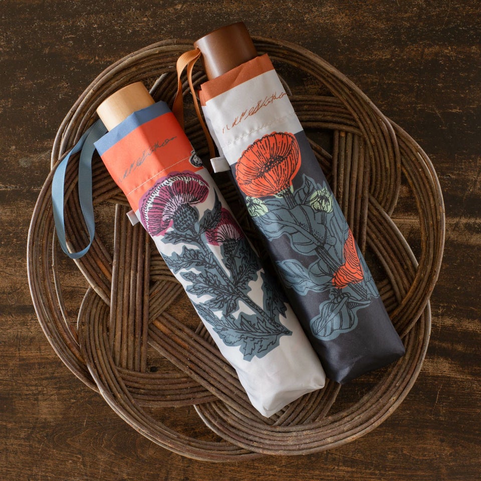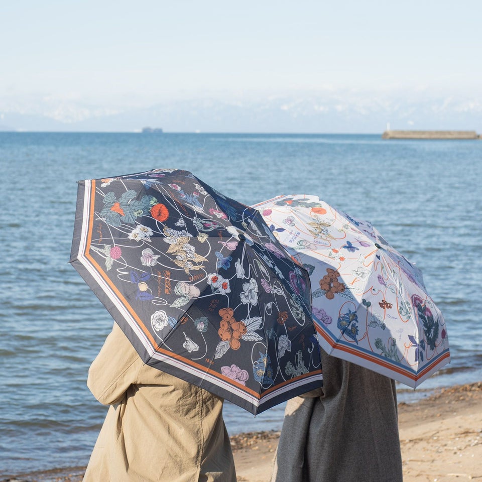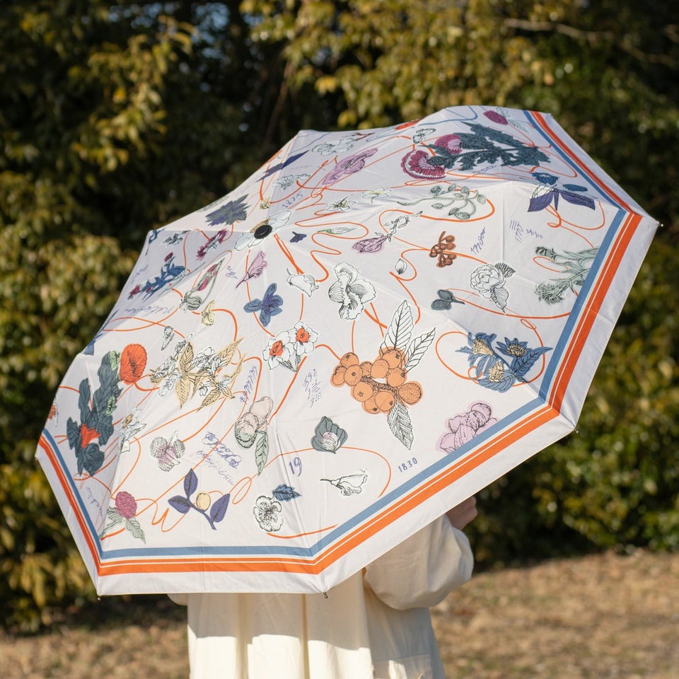 「植物図譜」と名付けられたこの傘は、ベージュと黒の2色展開。どちらの色味もいのうえさんによる華やかながらも落ち着いた色合わせが魅力的です。広げてみると生地はしっかりと厚く、荷物を持っていてもまるっと収まる大きさで大雨や強い日差し、どちらもしっかりと防げそうで1年中活躍してくれそうです。