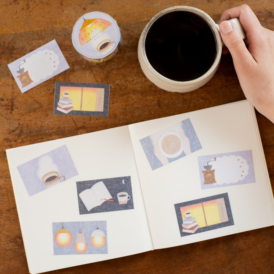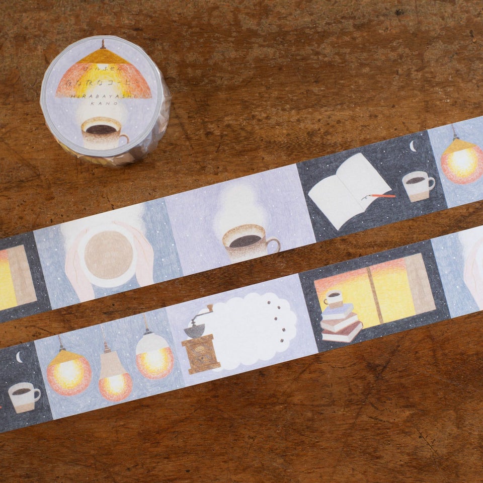 イラストレーター・平林香乃さんのロールふせん第2弾のテーマは「夜な夜なコーヒー」。ほわんと湯気がのぼるあたたかなコーヒーや、じんわり照らされるオレンジ色の灯にほっと心がゆるみます。 ゆったりとした夜の時間を過ごしながら、手帳や日記帳に今日のできごとやこれからの楽しみな予定を書き込んでみてはいかがでしょうか。