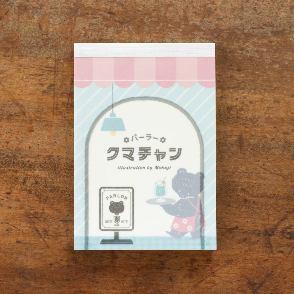 創作ユニット・Mokujiさんの第2弾メモパッドは、レトロなパーラーでクマちゃんがおもてなし! クリームソーダを運ぶ姿に、見ているだけでほっこり。色使いもデザインもレトロで、ついつい毎日使いたくなる可愛さです。