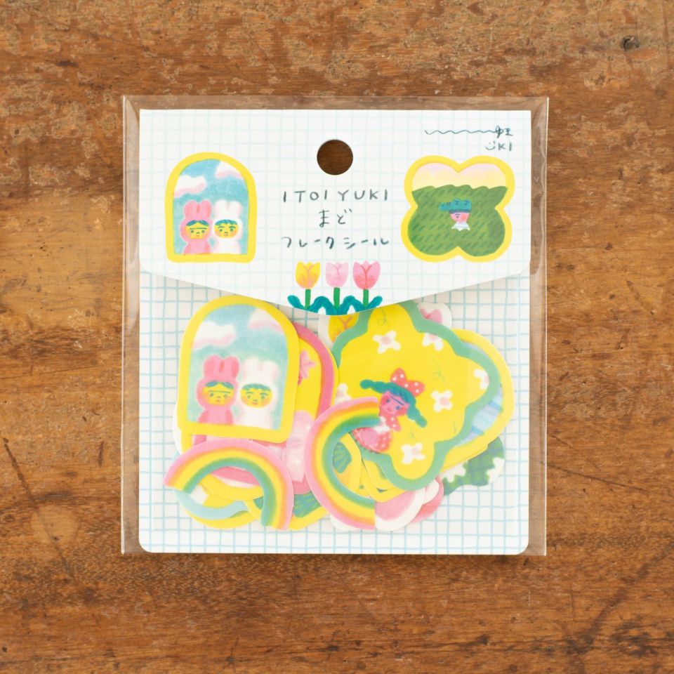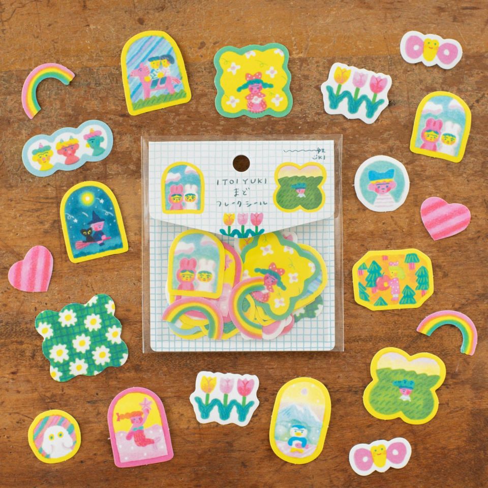 「うきうきするものづくり」をコンセプトに、毎日がうきうきするような、イラスト、絵本、雑貨などを手がけているイラストレーター・いといゆきさん。さまざまな形の窓枠から見える景色をカラフルに描いた「まど」は、いといさんの世界観をたっぷり堪能できるフレークシールです。まるで絵本の中から飛び出してきたような、愛らしいモチーフがぎゅっと詰まっていますよ。