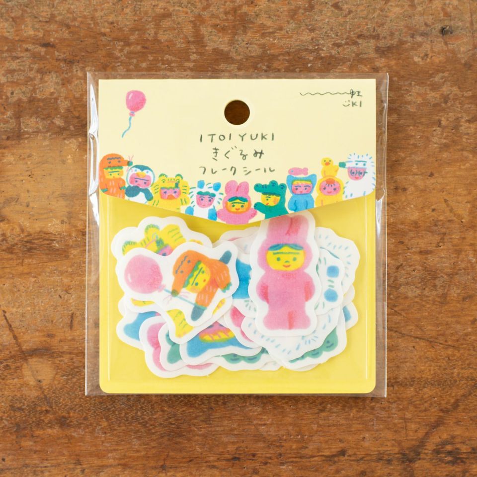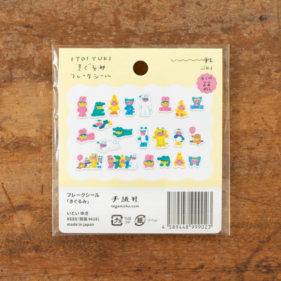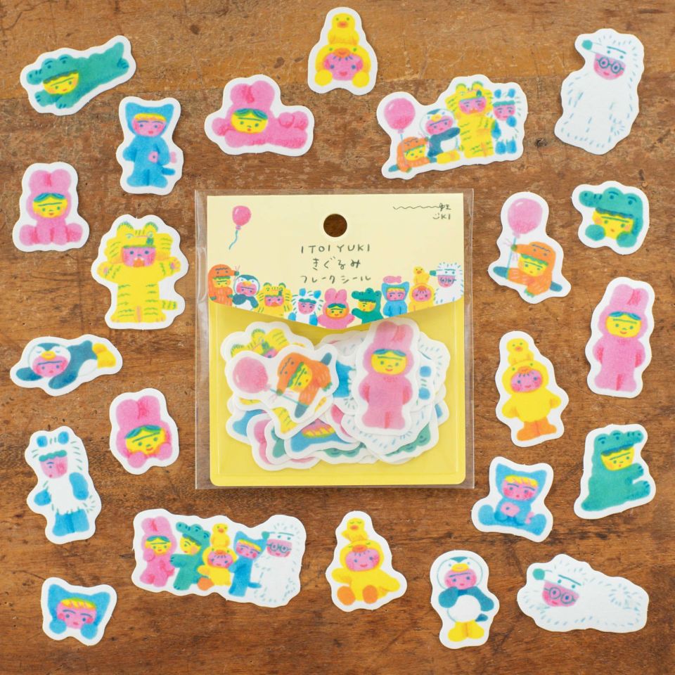 寝転んだり、座ったり、みんなで並んでいたり…。いろんなポーズのきぐるみたちがたっぷり楽しめるフレークシールです! 手を顔の前で揃えているきぐるみたちは、カレンダーやお手紙にちょこんと覗かせるように貼ってみるのも可愛くておすすめです。