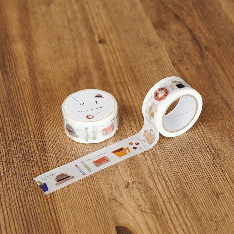 手帳やお手紙の時間がちょこっと楽しくなるような暮らしのモノコトを集めたデザインです。幅2cmと太めなテープなので、そのままペタッとデコる(貼る)のはもちろん、イラストを切り抜いたりアレンジも自由にお楽しみいただけます。