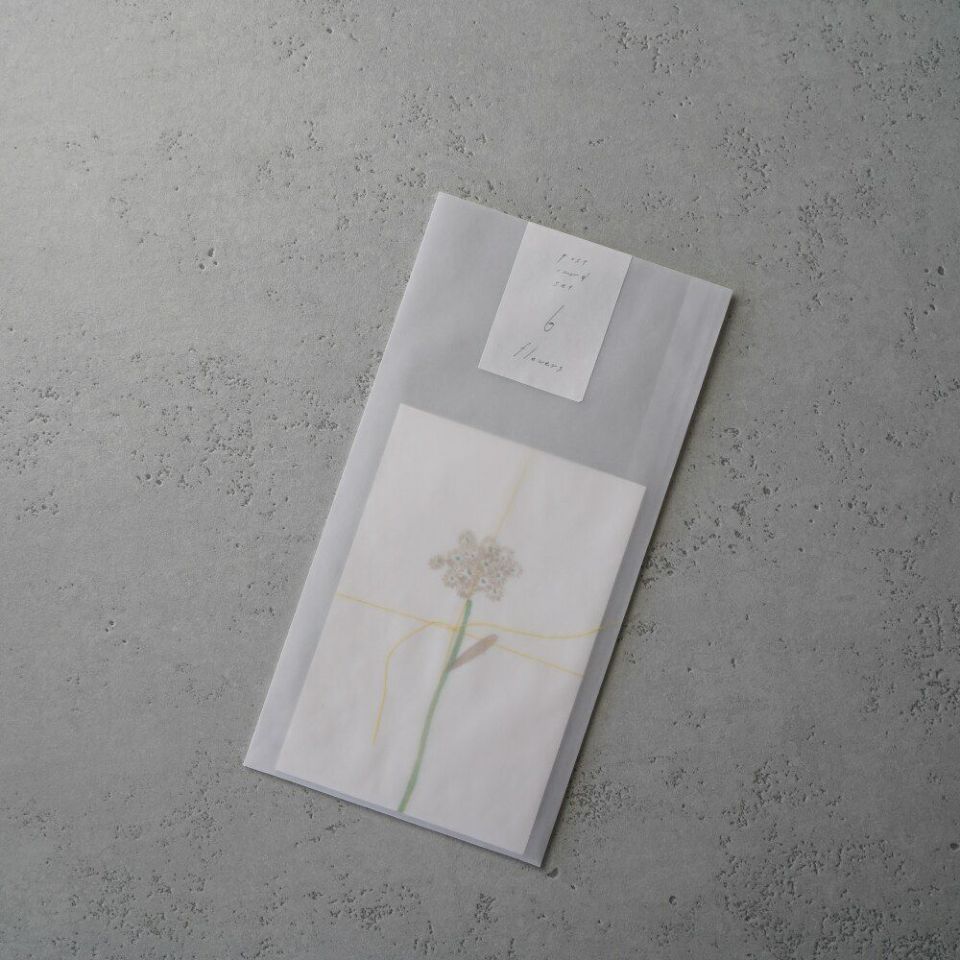 ハガキサイズのお花のカードセット。全部で6種類入っています。カード裏面は白無地となっております。写真のように、トレーシングペーパーの袋にパッケージングしてお届けいたします。お手紙はもちろん、お部屋に飾るのもおすすめです。