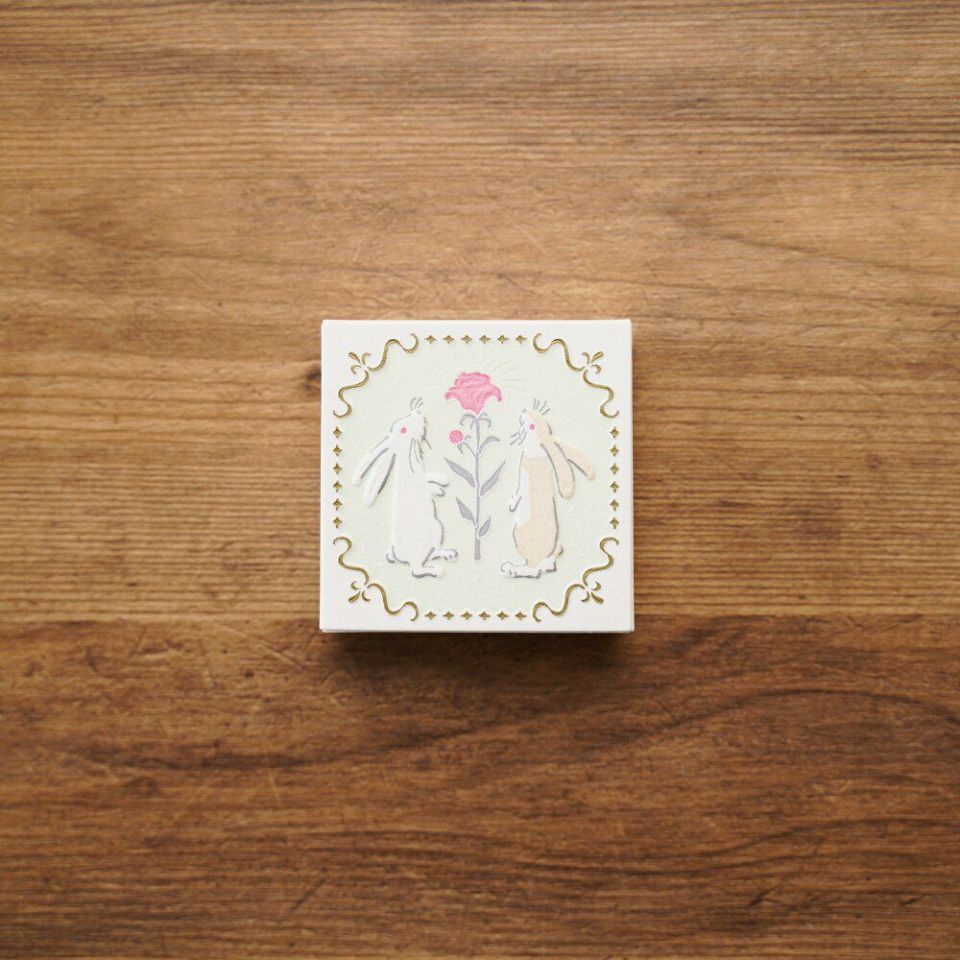 人気の「タイル柄隅金箱」に、新たな仲間「うさぎ」が加わりました! 活版印刷の凸凹で「うさぎ」が立体的に表現されています。なんと7色刷り(7回活版印刷してあります)! うさぎの輪郭を盛り上げ、その上から毛並みを空押しすることで立体的に仕上がっています。まわりのフレームやお花にも凸凹がありますので、ぜひ、手にとって触れてみてくださいね。