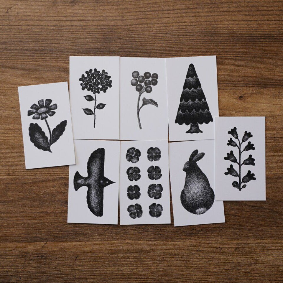 さまざまなシーンの“挿絵”としてお使いいただくために、イラスト以外は何も印刷されていません。裏面にメッセージを書いて贈りものに添えたり、ネームスタンプを押して名刺にしたり、ご自由にお使いください。