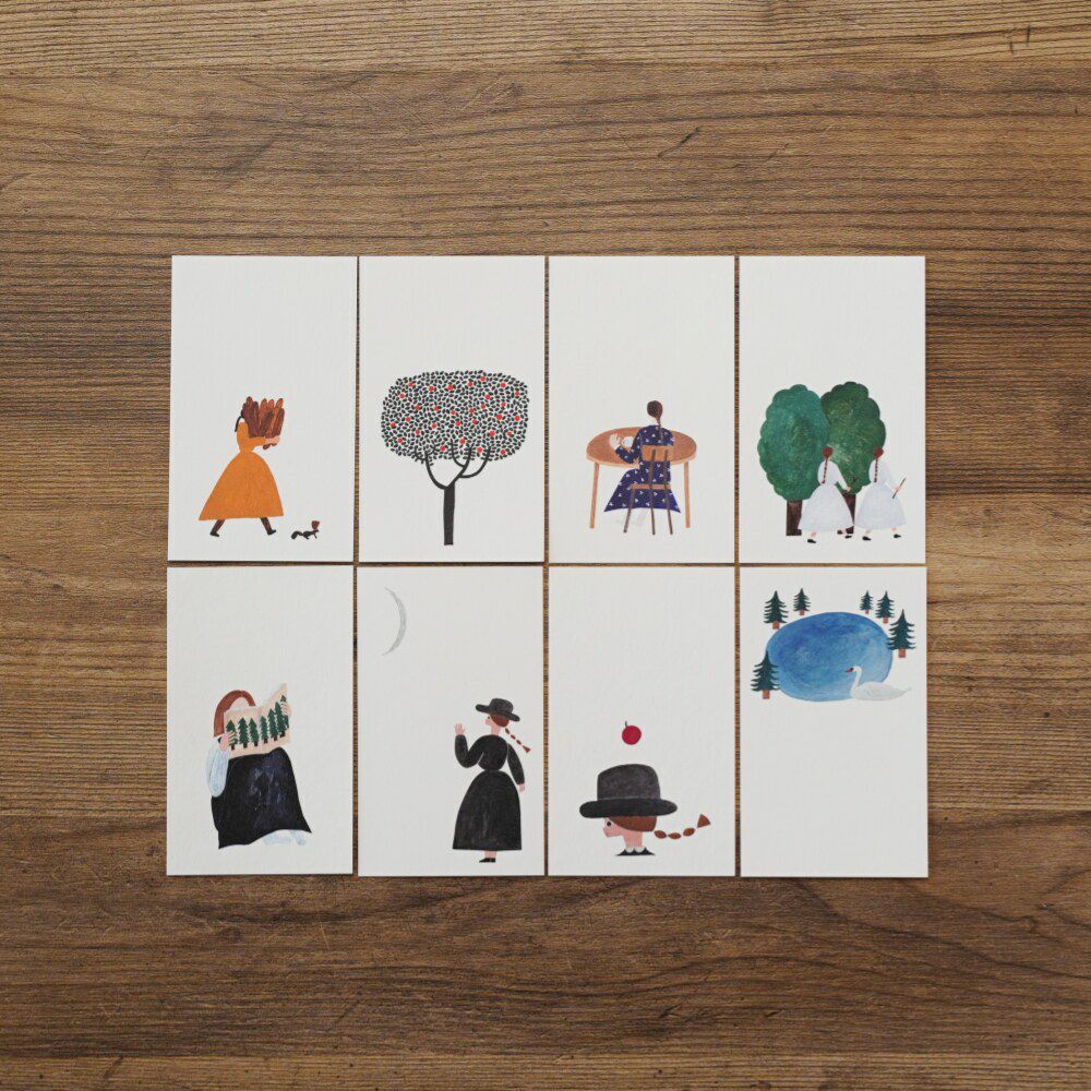 名刺サイズのカードが、5柄 各3枚 合計15枚入っています。ポストカードと同じ、厚みのある紙を使用していますのですこしきちんとした印象になります。名前を書いて名刺代わりに、メモに、ラッピングに、ちょっとひとこと添えたいときに、どうぞお使いください。