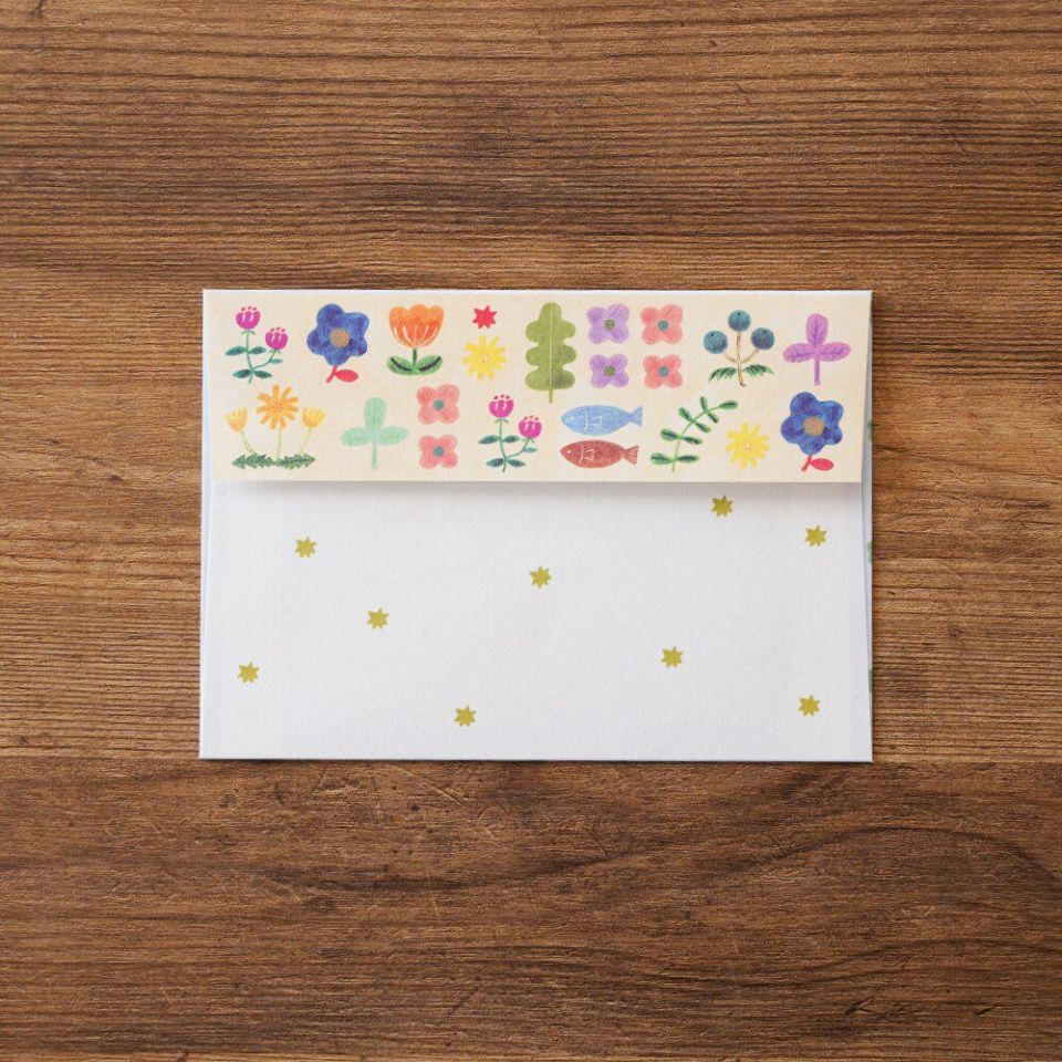 はがきや二つ折のA5サイズの便箋がちょうど入る大きさの封筒です。お手紙にはもちろん、手帳と組み合わせてカード入れにしたり、ポストカード入れにするのにもおすすめ。おそろいの柄の便箋「布川愛子 便箋 Cat and Onepiece」もございます。