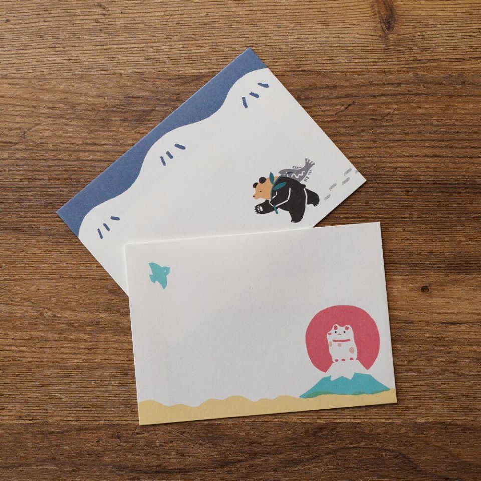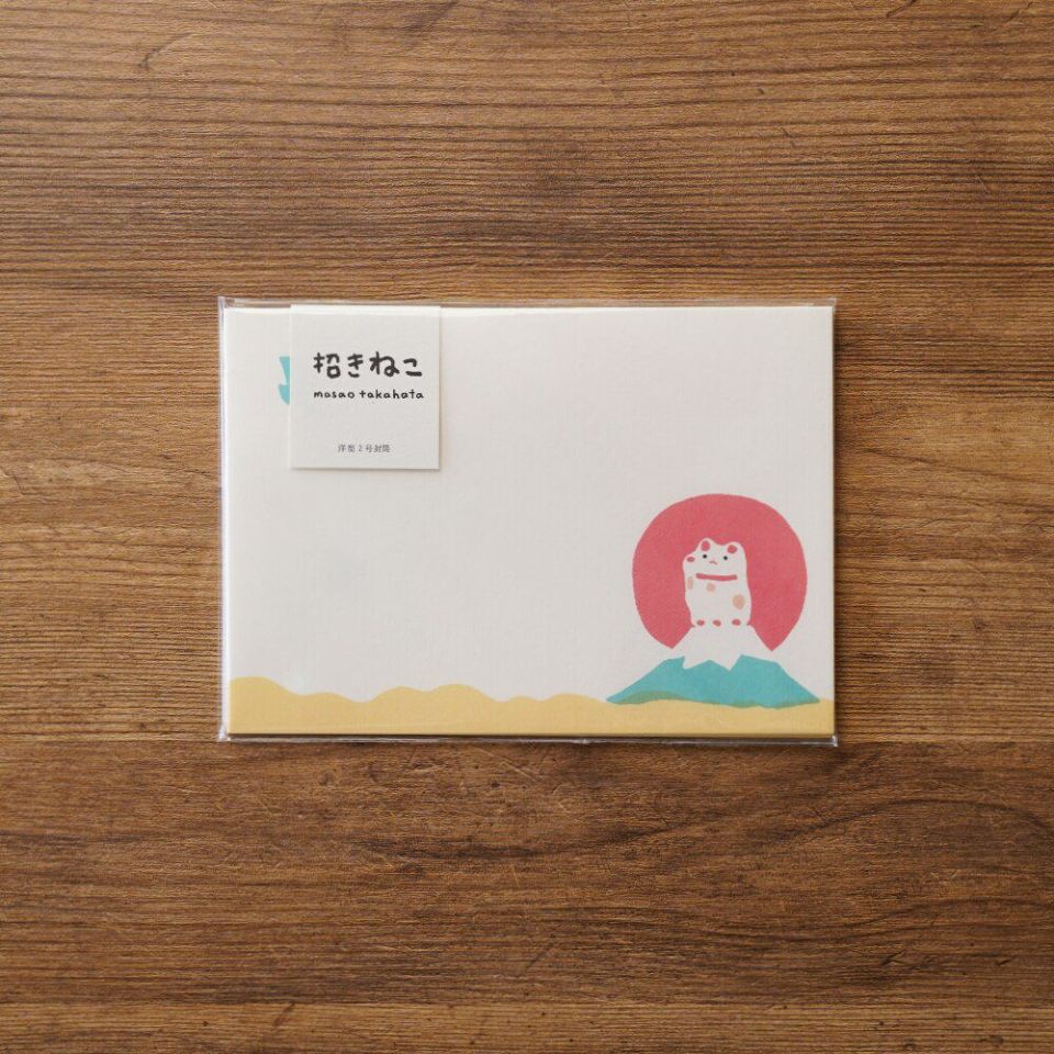 はがきや二つ折のA5サイズの便箋がちょうど入る大きさの封筒です。お手紙にはもちろん、手帳と組み合わせてカード入れにしたり、ポストカード入れにするのにもおすすめ。おそろいの柄の便箋「高旗将雄 便箋 招きねこ」もございます。