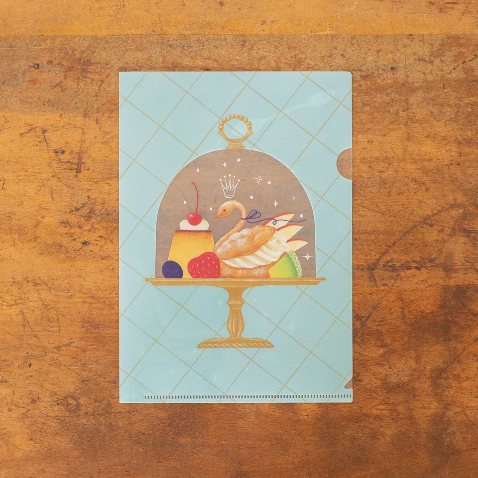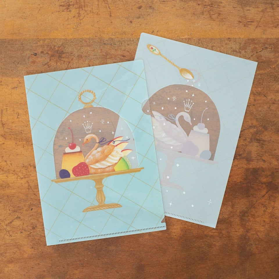 今回ア・ラ・カル堂さんが描いたのは、ガラスドームに入ったスワンシューやフルーツにプリン。まるで宝石のように美しく、手に取りじっと眺めていたくなるようなデザイン。使いやすく、ギフトにもぴったりなA5クリアファイルは、紙ものやチケット・写真やフライヤーなど、ちょっとしたものを挟むのもオススメです。