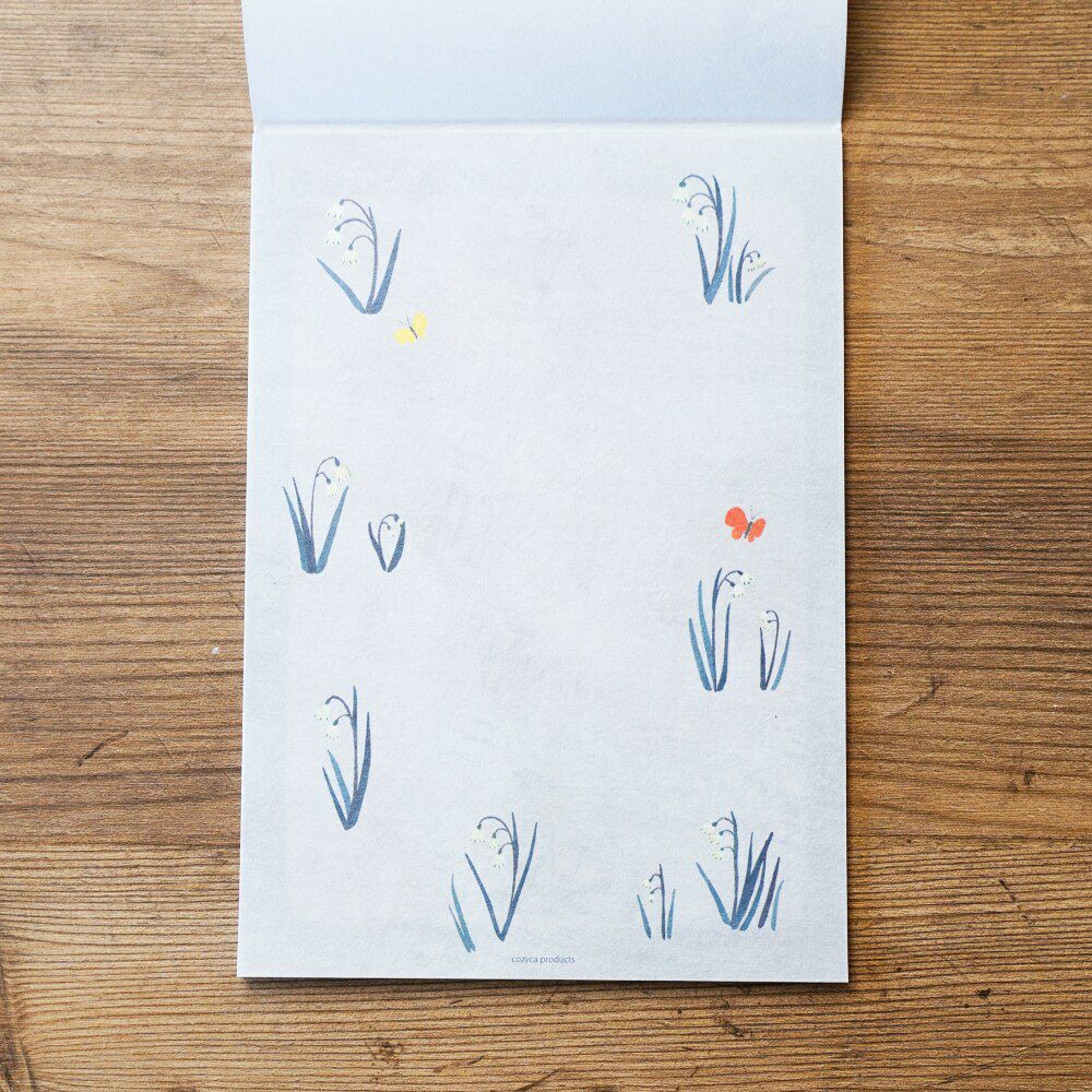 散歩している時に見かけるような、道端にさりげなく咲いている草花にフォーカスした便箋。植物のやさしい力強さや、心地よい風を感じるような大森さんのイラストをお楽しみいただけます。
