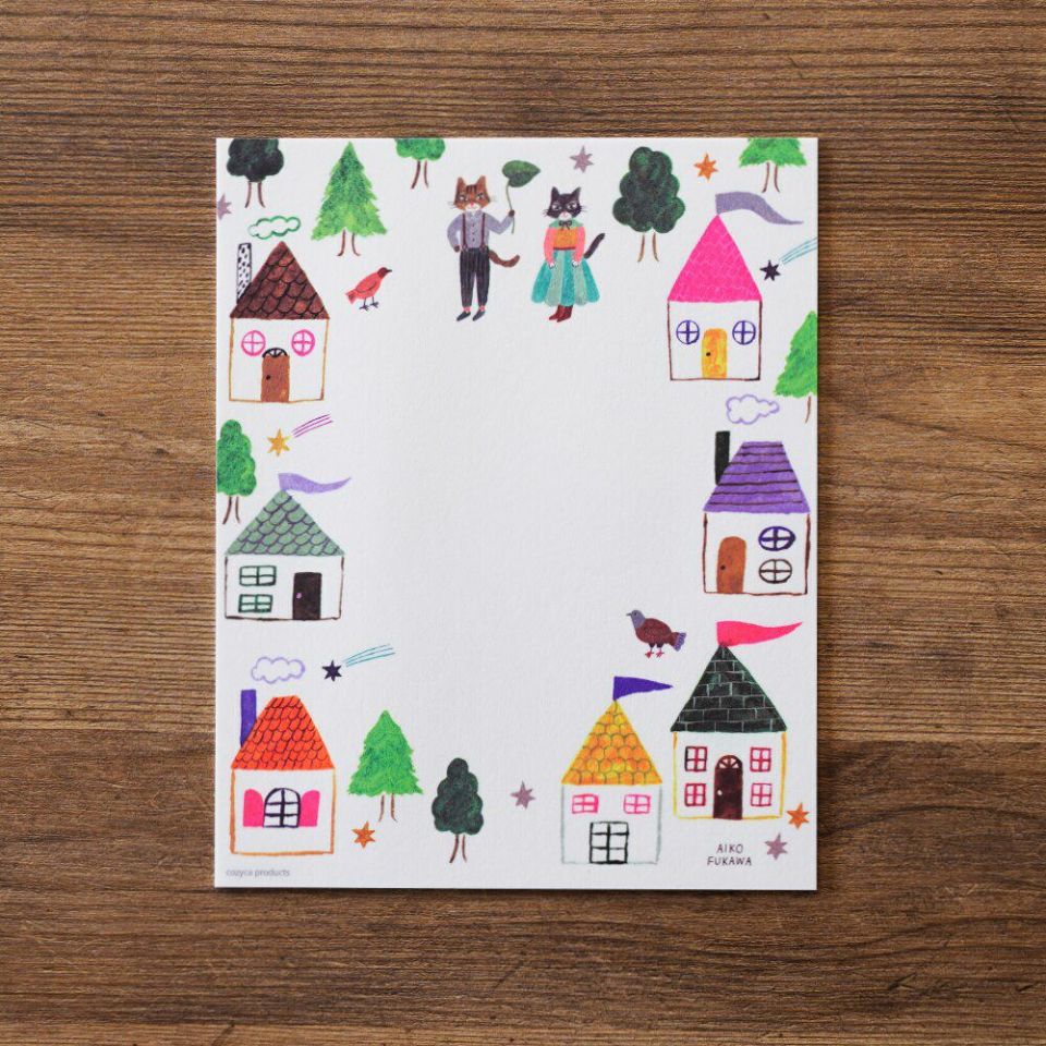 布川愛子さんのレターセットです。色とりどりの家とおしゃれな猫たちの便箋は、まるで絵本の一場面のような可愛らしさです。封筒の宛名面やふた部分にも、カラフルな家々が並んでいます。