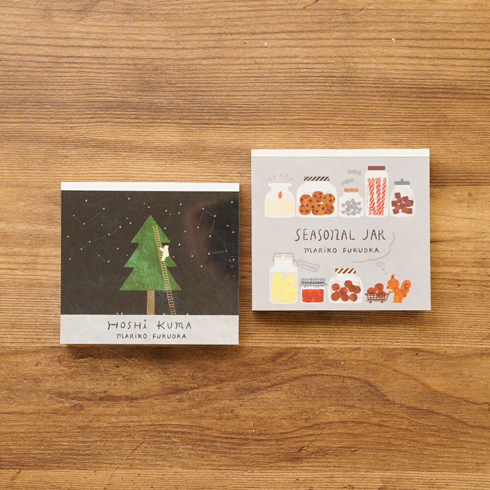 春はいちごジャム、夏はレモネード、秋はナッツのぽってりしたクリーム、冬はお菓子にキャンドル。瓶詰めをモチーフに季節の移り変わりが描かれた、かわいいブロックメモです。