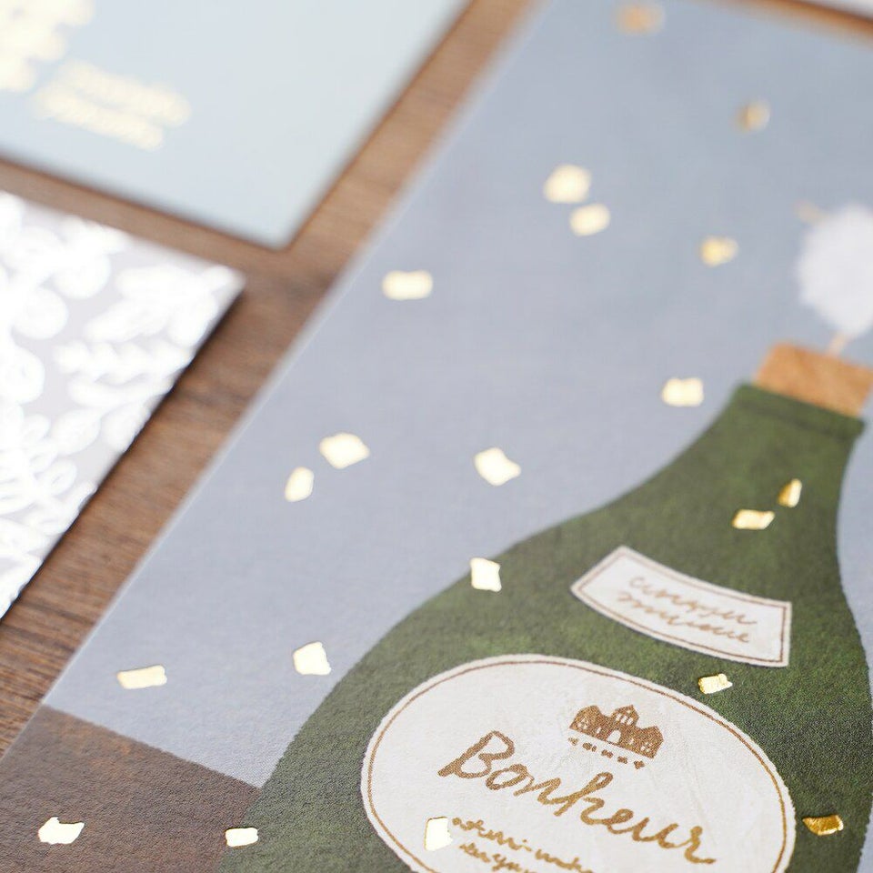 きらりと輝く箔押し加工が美しい、福岡麻利子さんのおしゃれなポストカードです。裏面にもフルカラー印刷を施しています。大切な方への贈りものに添えたり、お部屋のインテリアとして飾るのもおすすめです。ボトルのラベルの「Bonheur」は、フランス語で「幸福」という意味です。