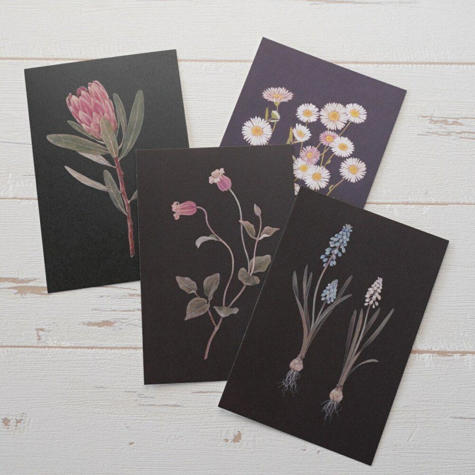 「人と会った時の話題のひとつになればいいな」という思いを込めて、動植物や食べ物、雑貨など身近なもののイラストを描いている、ささきめぐみさんが標本画のようなイメージで描いた植物のシリーズ。ベル型のクレマチスの絵を描いたポストカードです。