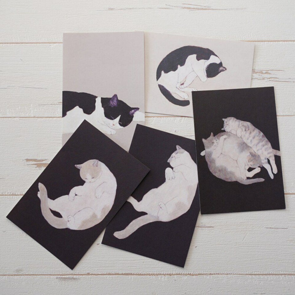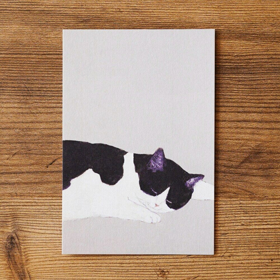 「人と会った時の話題のひとつになればいいな」という思いを込めて、動植物や食べ物、雑貨など身近なもののイラストを描いている、ささきめぐみさんのポストカードです。幸せそうに寝ているハチワレ猫です。